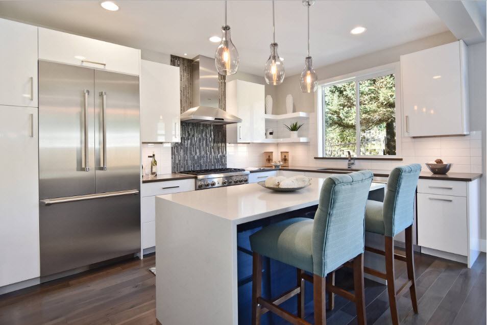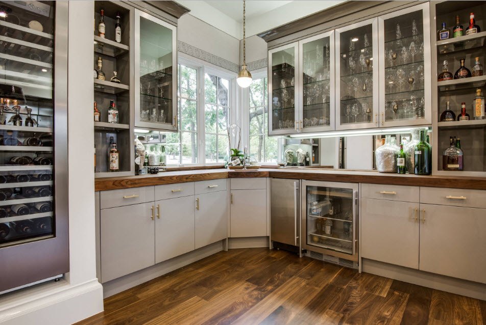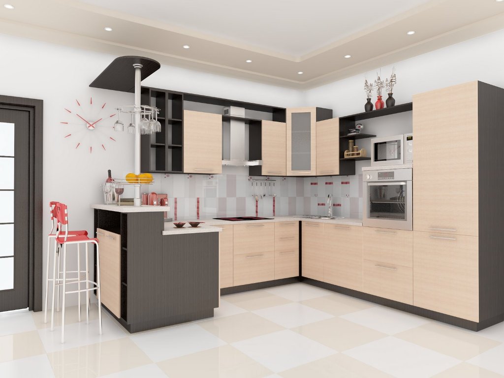 Combinando várias salas dá liberdade considerável para escolher móveis. Com a ajuda de opções de canto, é mais fácil organizar o zoneamento. Nas casas e apartamentos de uma grande área, a cozinha de canto é combinada com um balcão de bar.