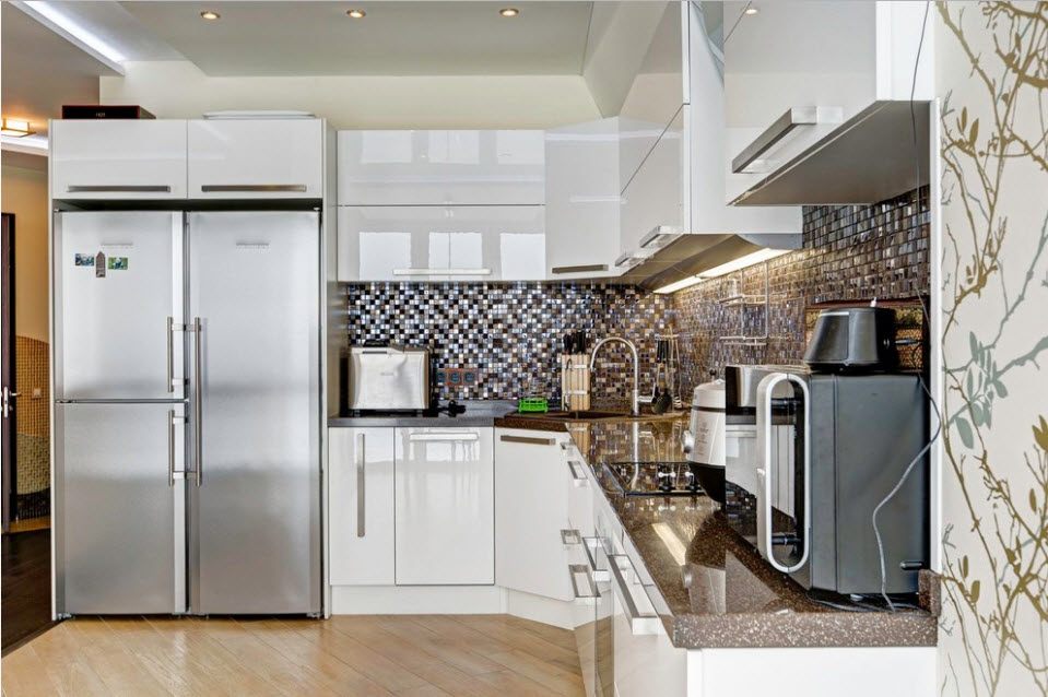 Por que essa opção é popular? A colocação angular é conveniente para a anfitriã. A mobília é compacta. Menos tempo gasto em movimento, todas as ferramentas necessárias, pratos, equipamentos e equipamentos à mão. Além disso: