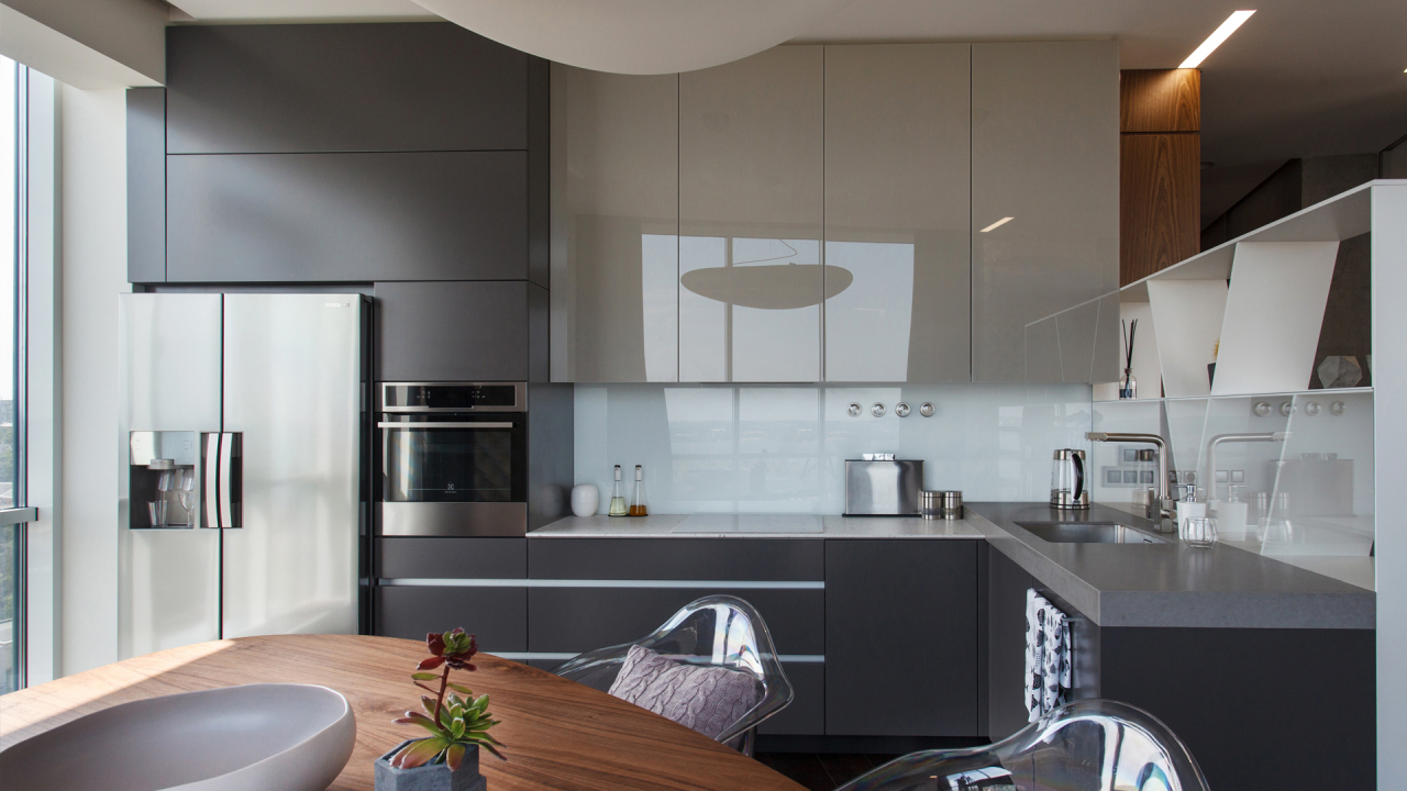 - O vidro é a tendência dos últimos anos. Fabricantes oferecem modelos de cores únicas de cores diferentes, com padrões para decorar armários e tampos de mesa.