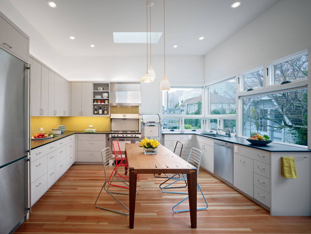 - A instalação de móveis em formato de g visualmente redimensiona cozinhas longas e estreitas.