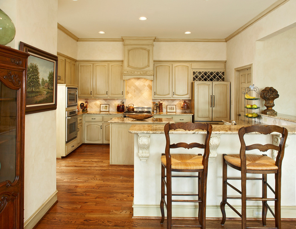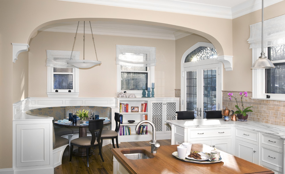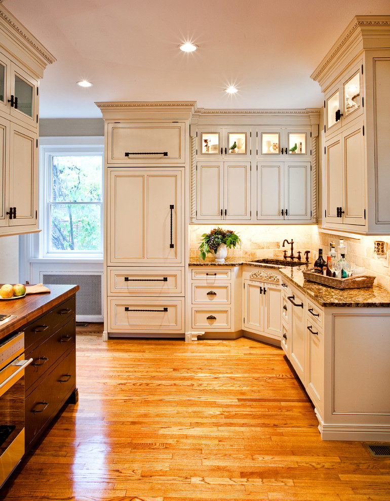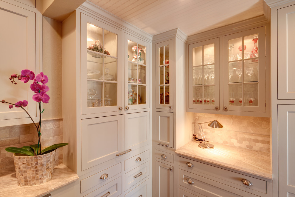 Clássico tem linhas claras. Usado materiais caros. Cores: madeira natural, bege, branco. Na maçaneta da porta antiga.