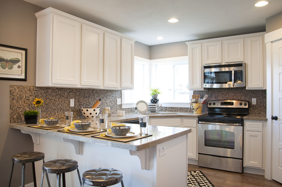 Alojamento peninsular aplicável em apartamentos e casas com layout livre. Os desktops são perpendiculares à parede e separam a unidade da cozinha do zonas recreação o corredor ou sala de estar.