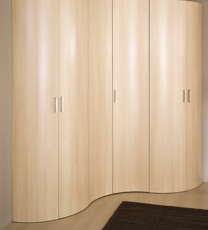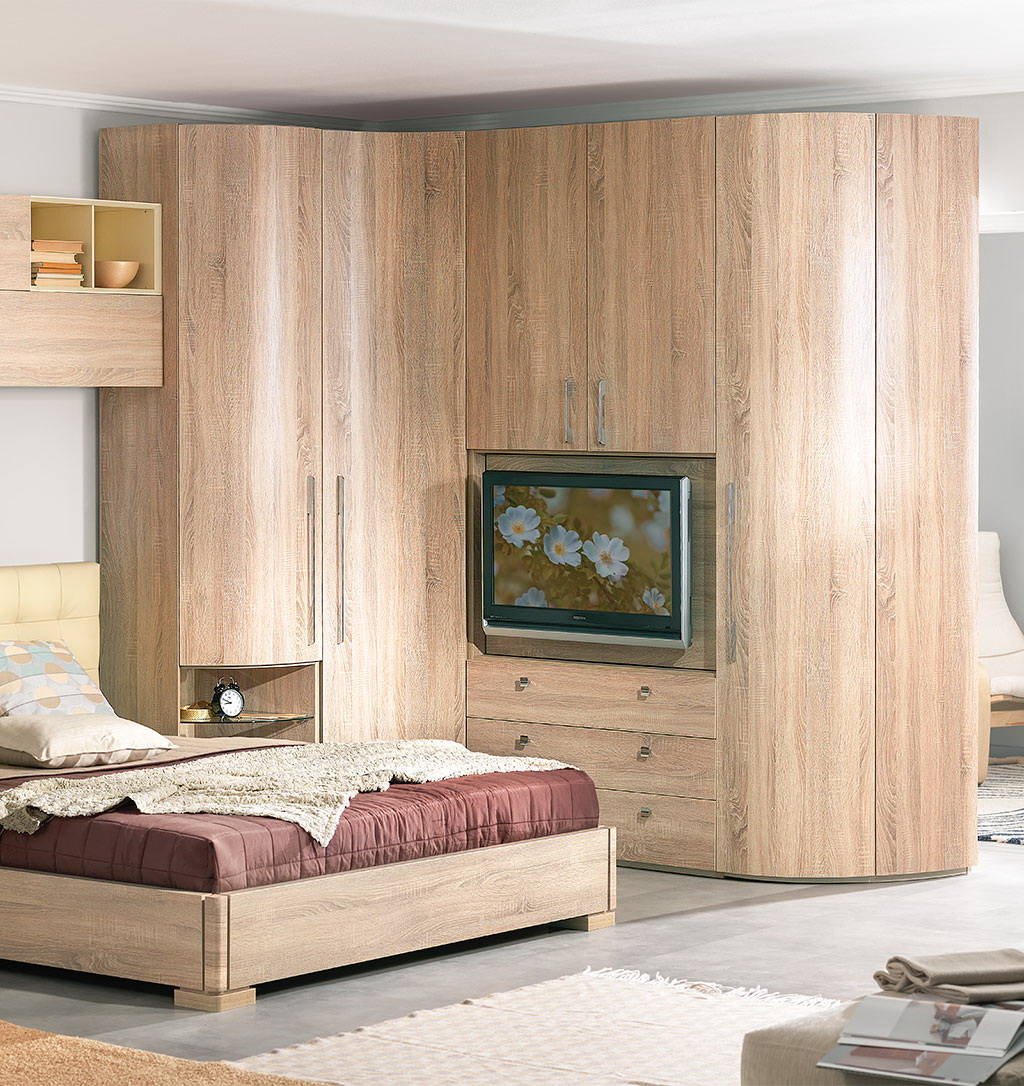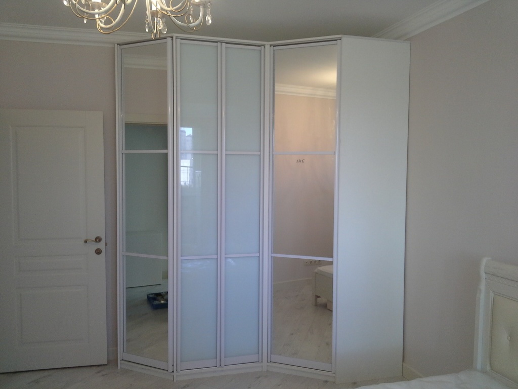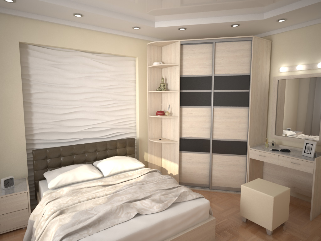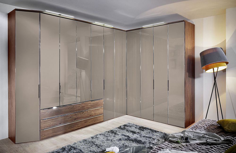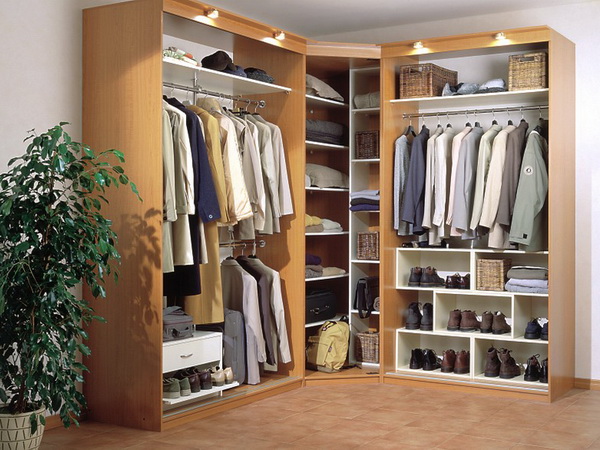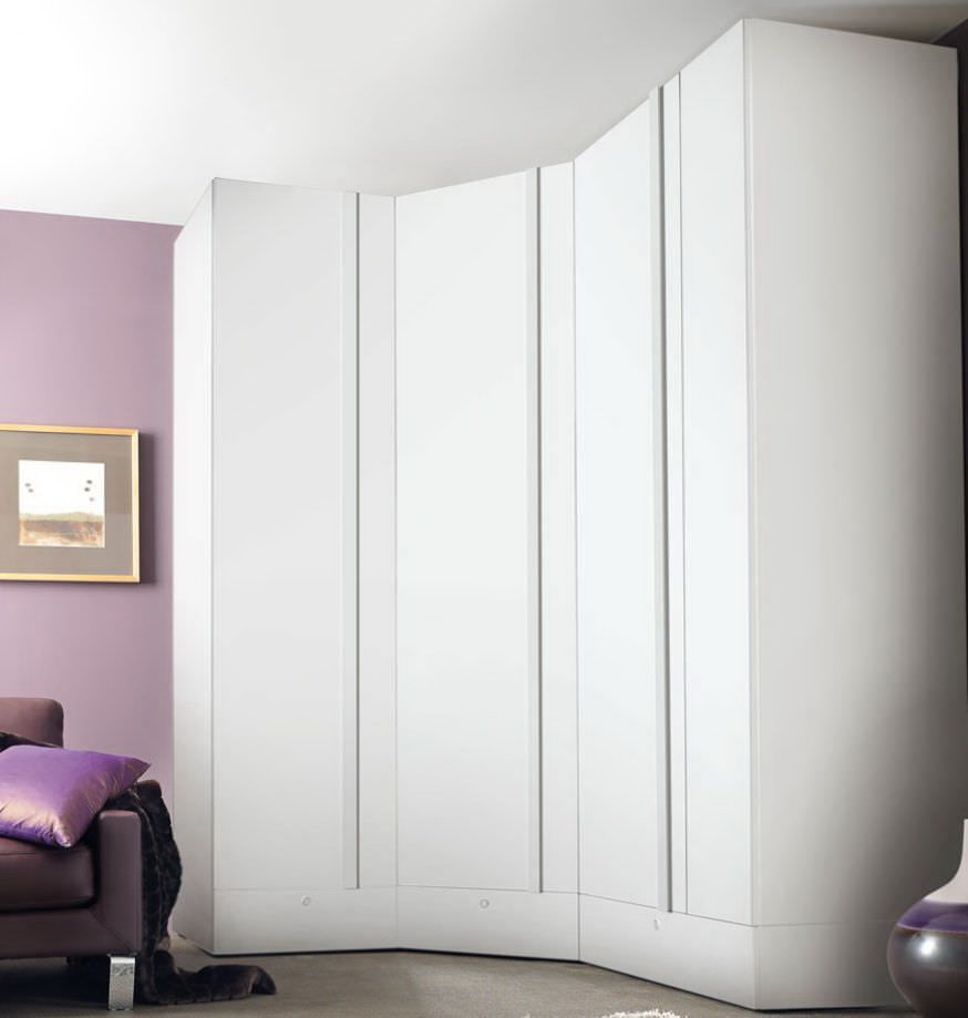 Fornecer um quarto de canto com um guarda-roupa embutido é a melhor solução se o espaço permitir. Esta solução estilística é adequada para o quarto principal, que combina o descanso adequado e é funcionalmente otimizado.