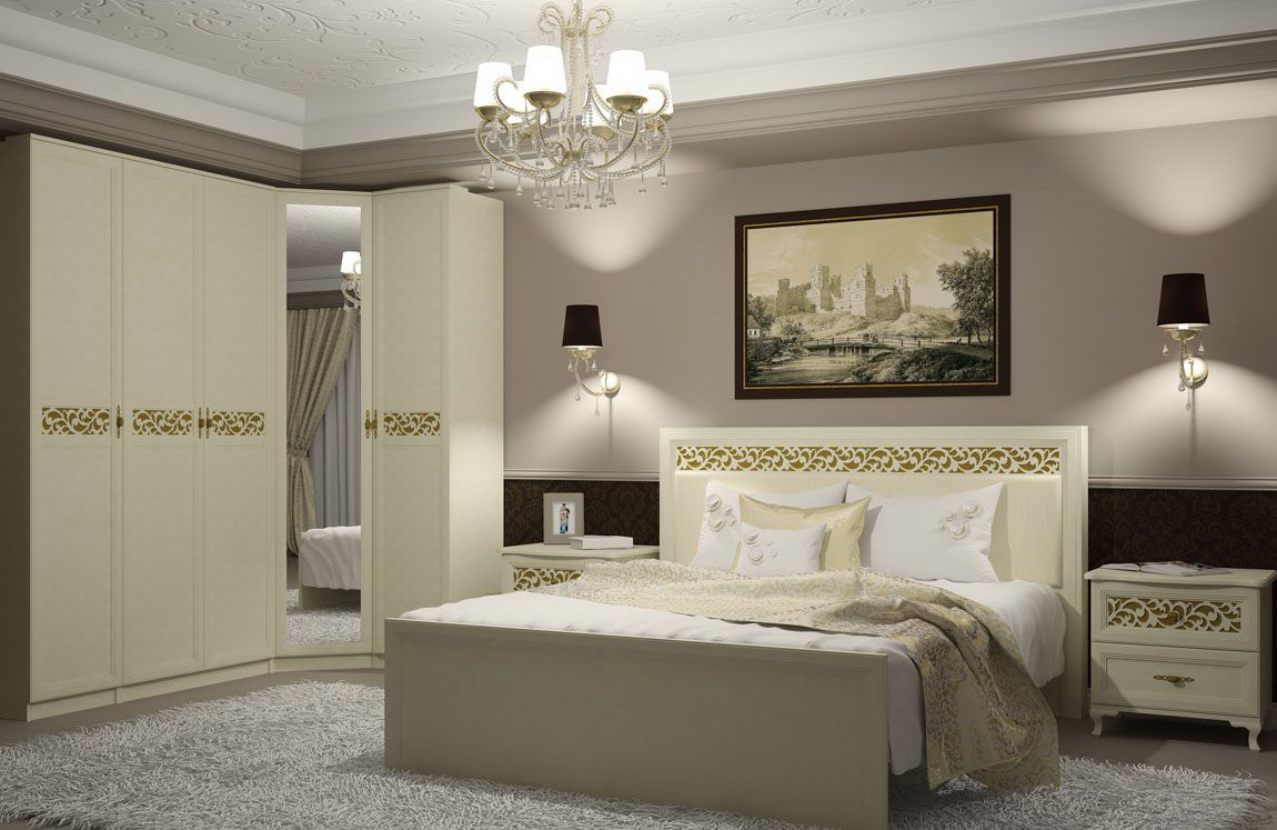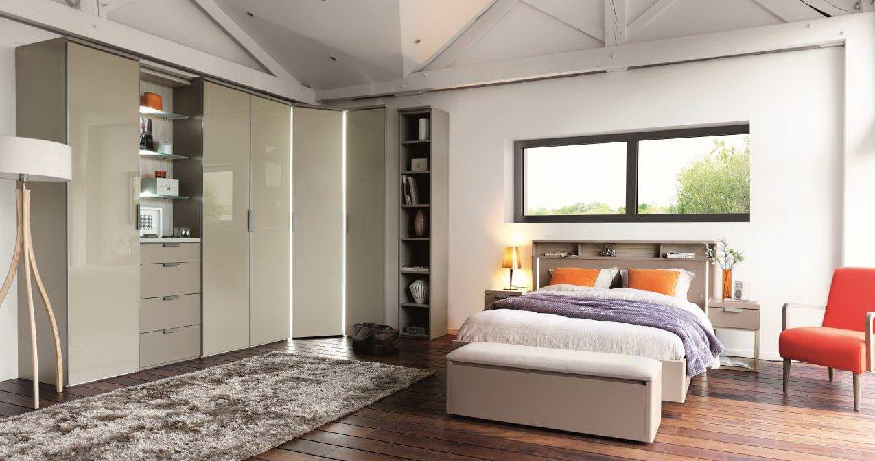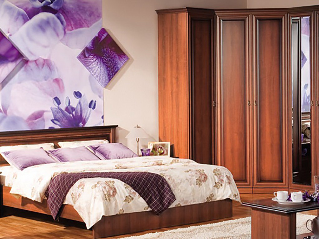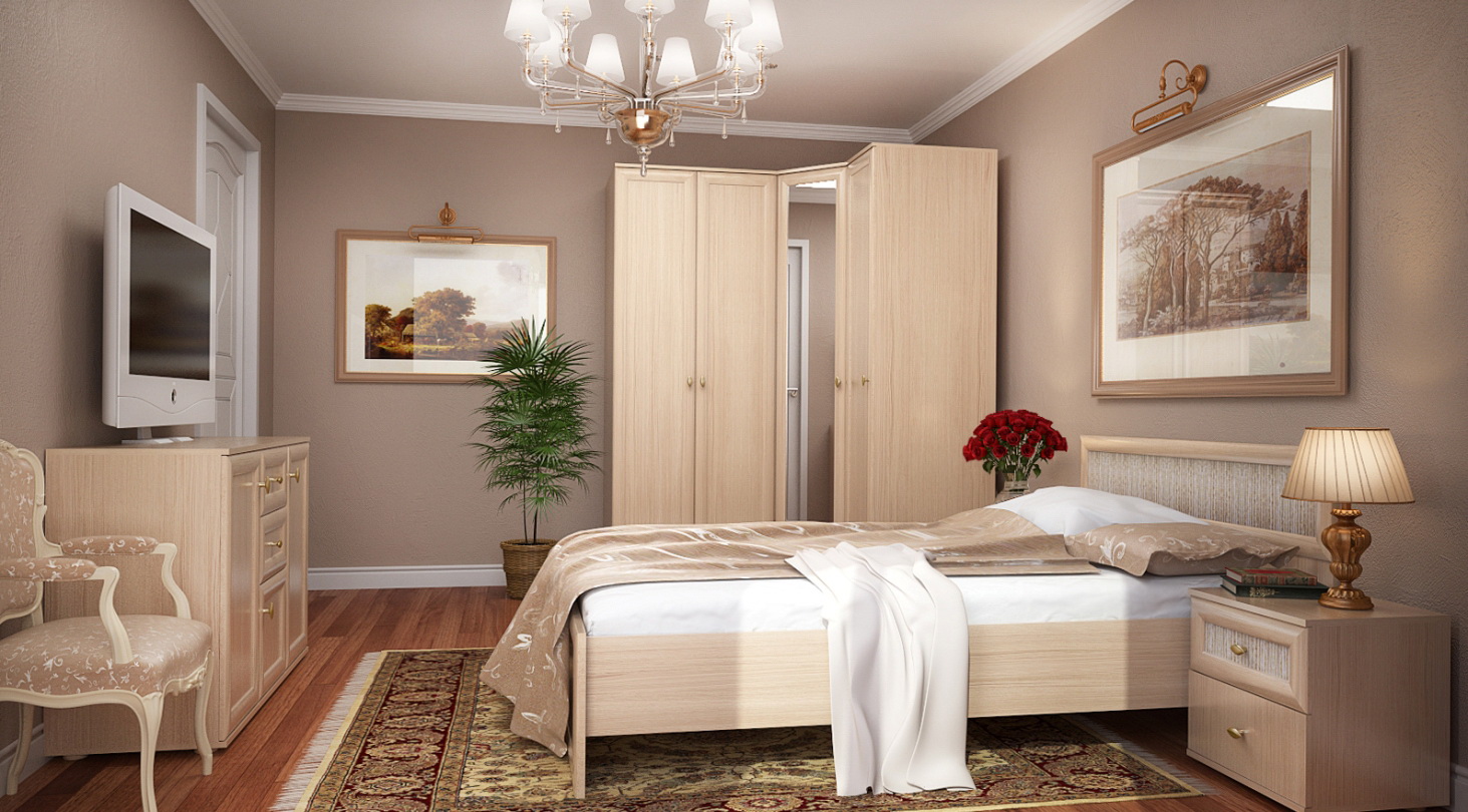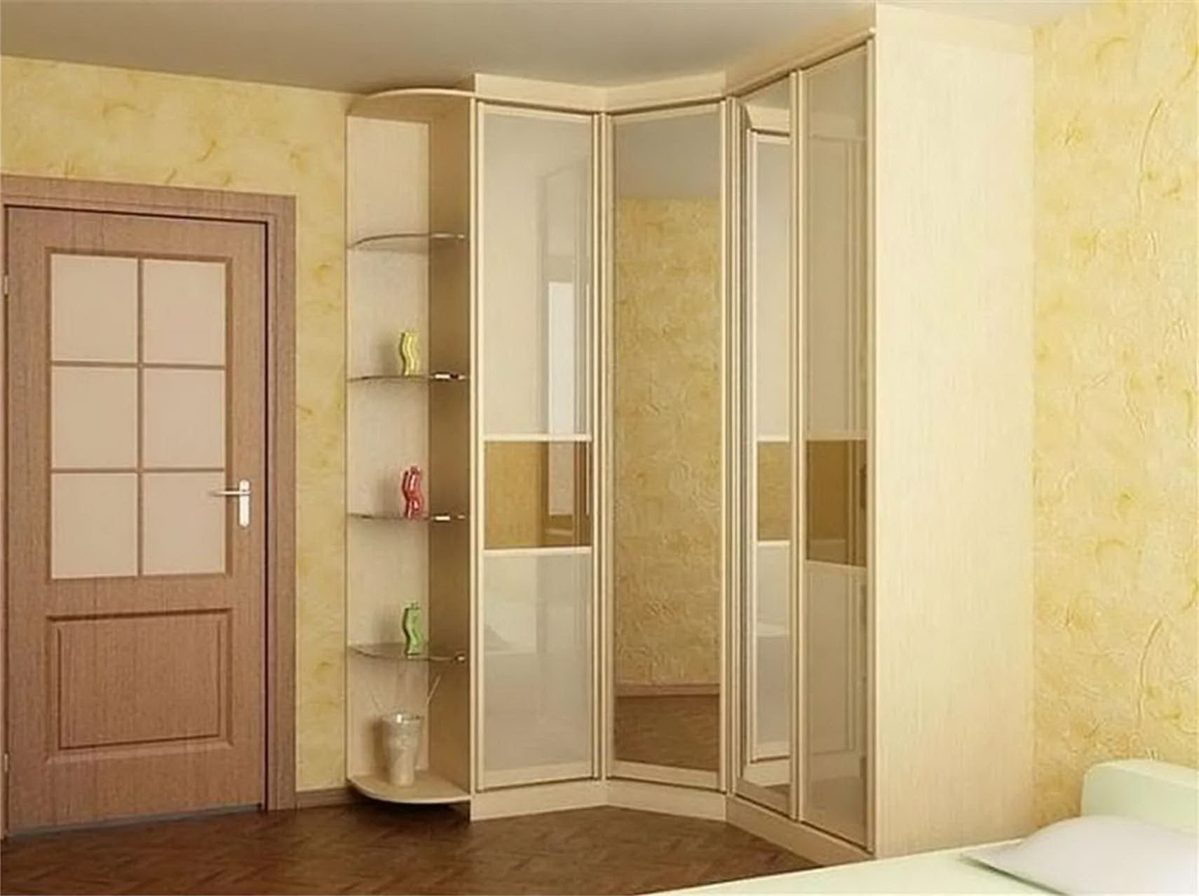 Fornecer um quarto de canto com um guarda-roupa embutido é a melhor solução se o espaço permitir. Esta solução estilística é adequada para o quarto principal, que combina o descanso adequado e é funcionalmente otimizado.