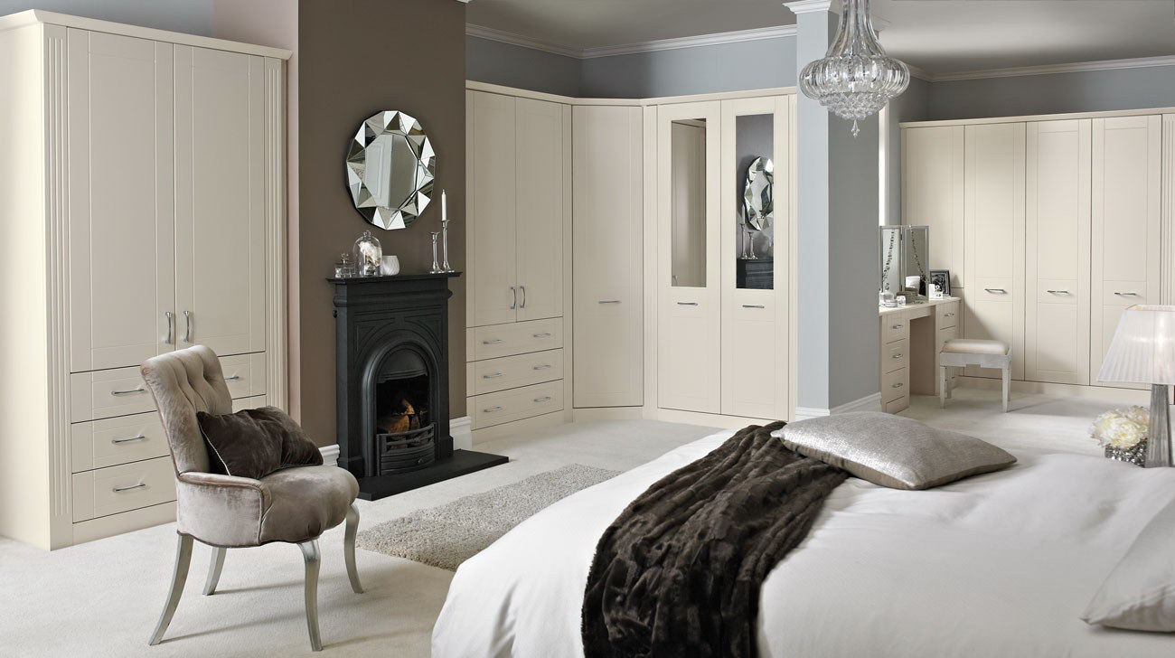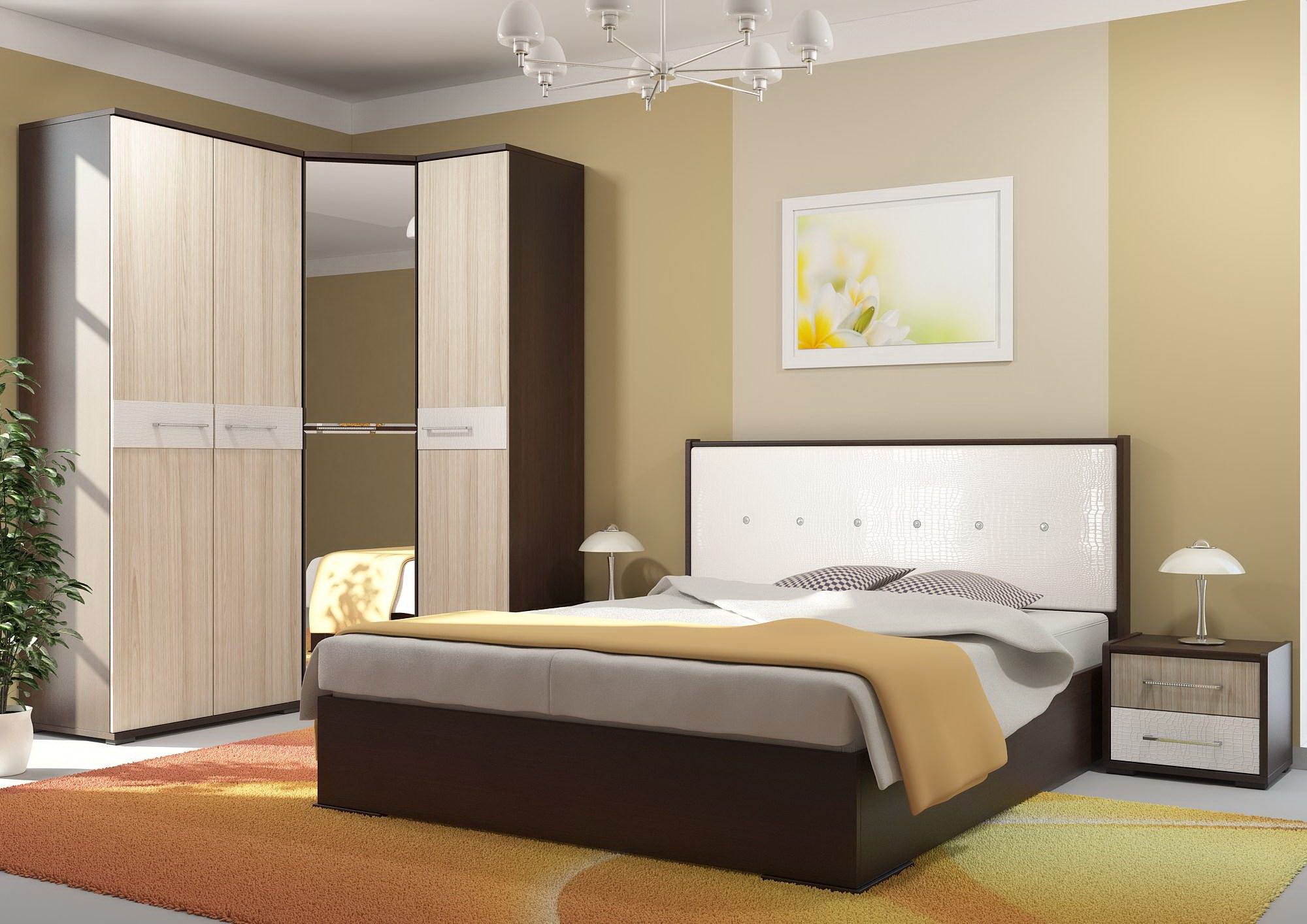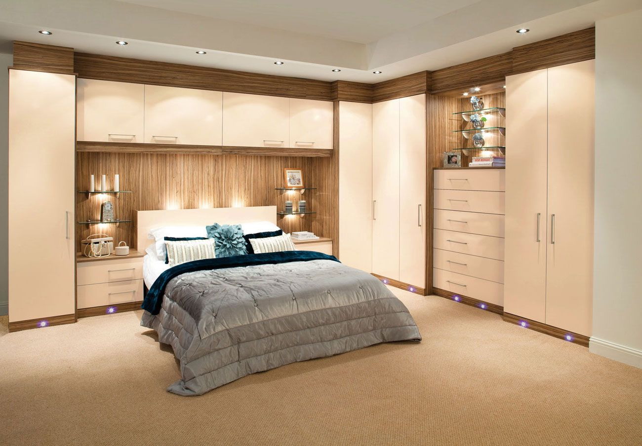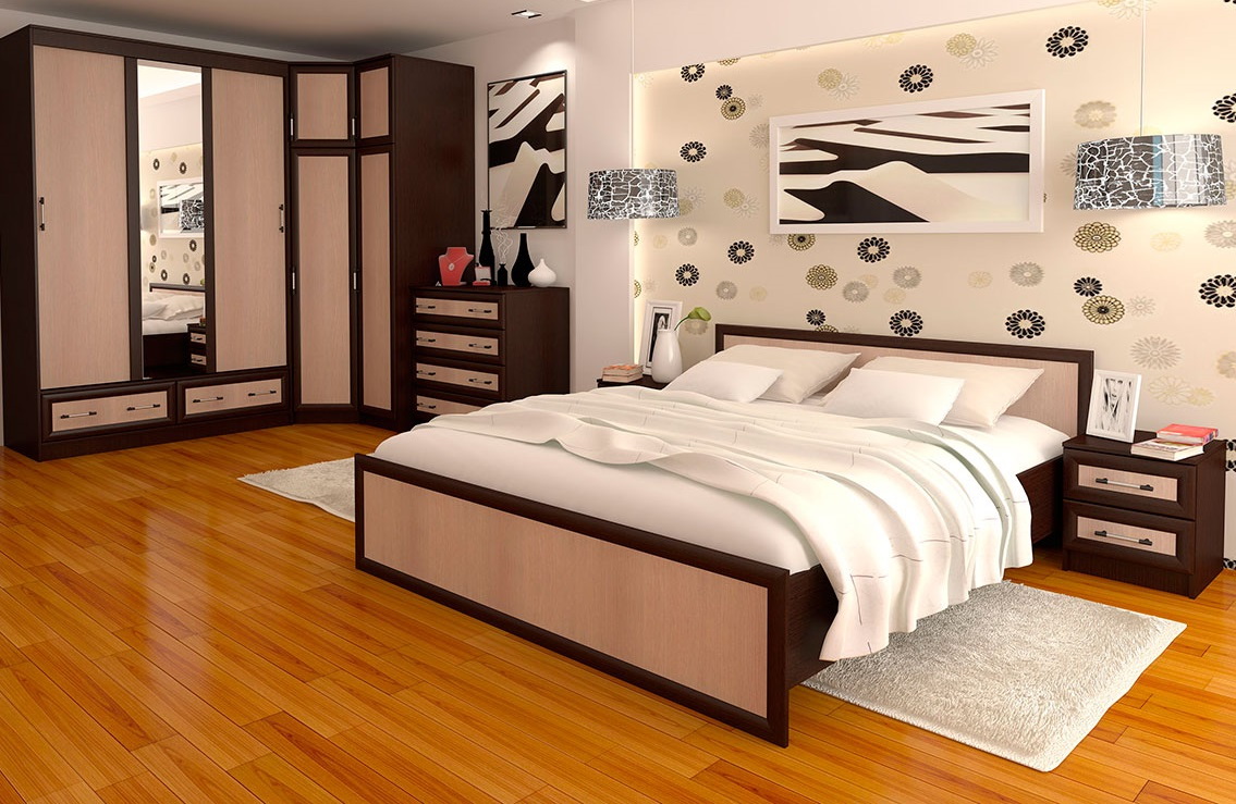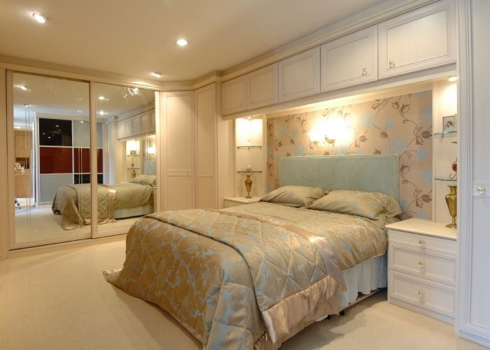 Fornecer um quarto de canto com um guarda-roupa embutido é a melhor solução se o espaço permitir. Esta solução estilística é adequada para o quarto principal, que combina o descanso adequado e é funcionalmente otimizado.