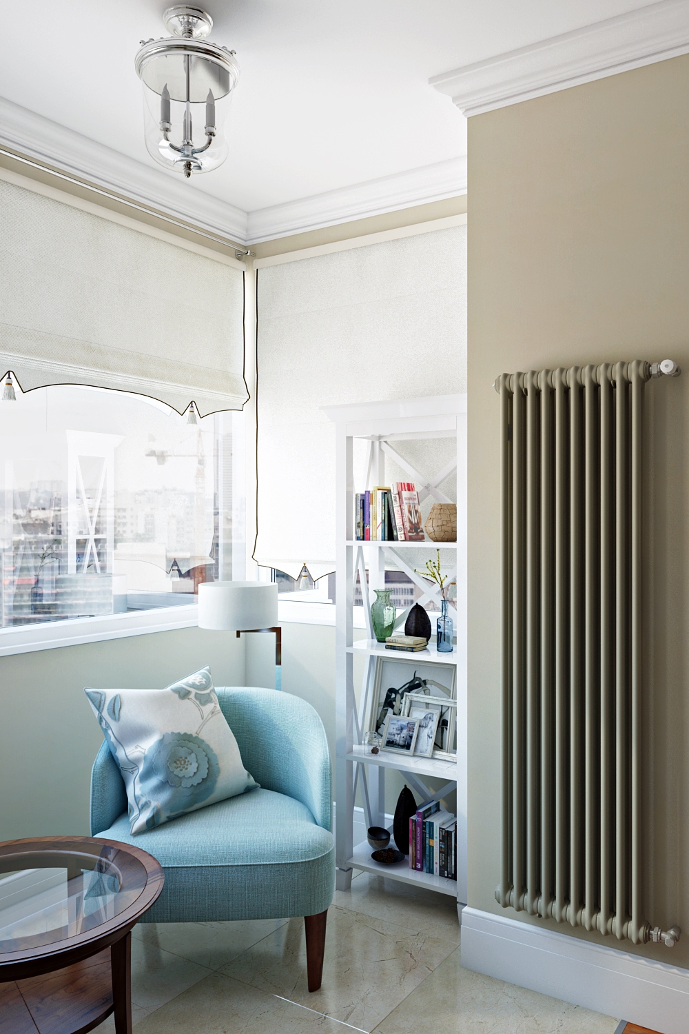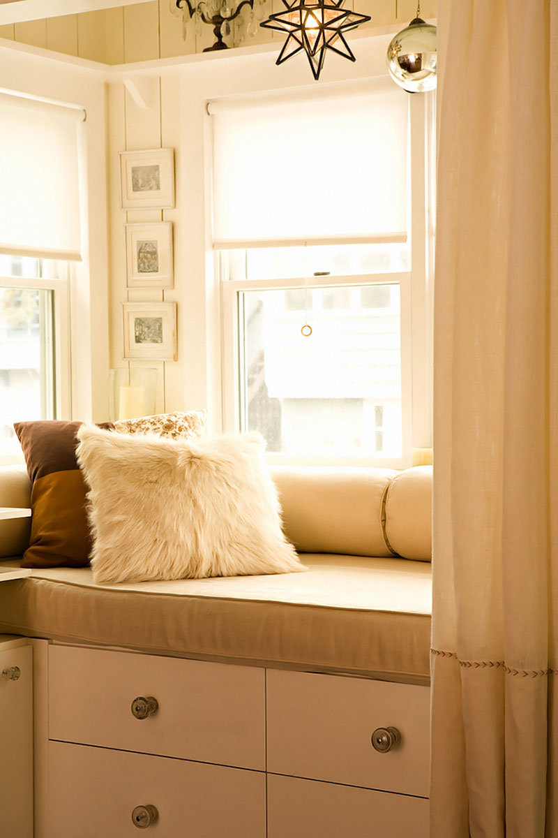 Espaço na frente pela janela também não deve ser desperdiçado. Pequeno a mesa, uma cadeira ou banco, localizado sob a janela, cria uma área de leitura aconchegante.