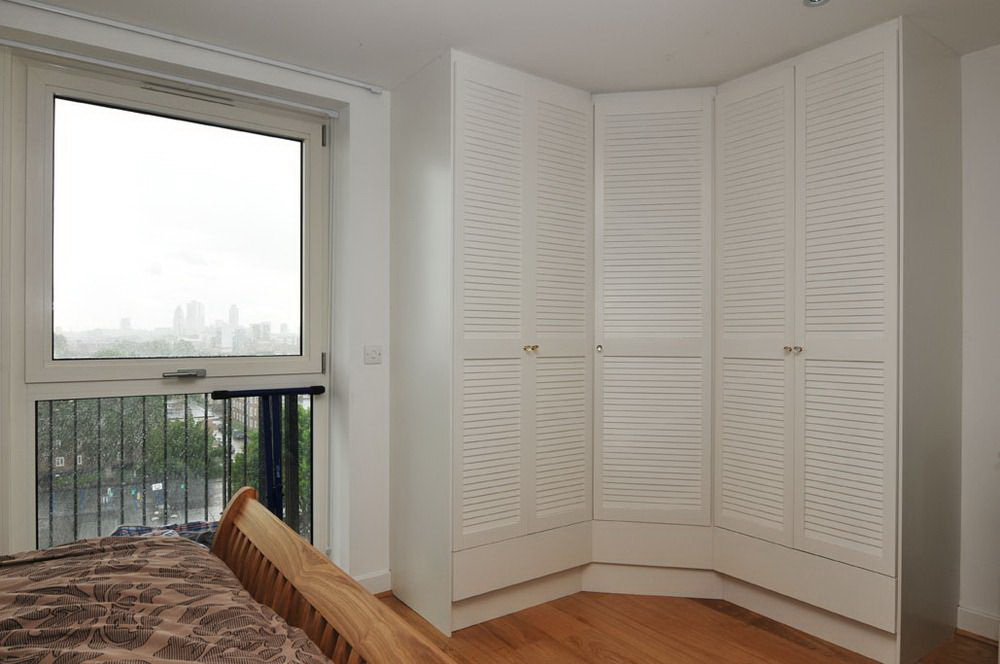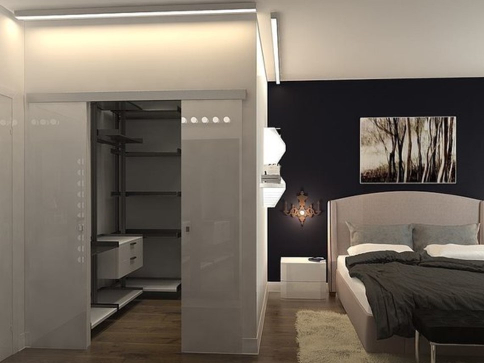Para usar o espaço morto, tente fazer um gabinete na forma de um L inglês com o seu metro quadrado. Construa um guarda-roupa escondido bem no recesso e adicione portas dobráveis para libertar o quarto da desordem e da superlotação. Este armário será projetado para acomodar os tipos mais específicos de roupas e acessórios.
