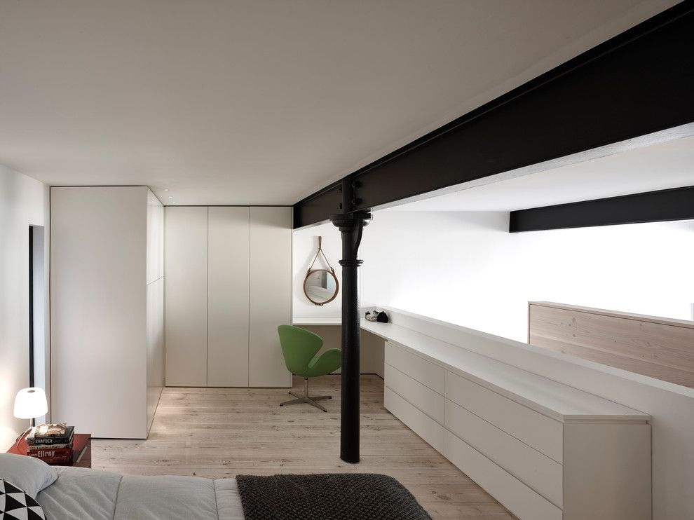 Armário embutido adequado para espaço extra para pendurar roupas. Ou faça uma versão menor e mais leve de um guarda-roupa tradicional que se encaixa em um espaço limitado. Em seguida, faça o acabamento em madeira clara para combinar com o conjunto de quarto.
