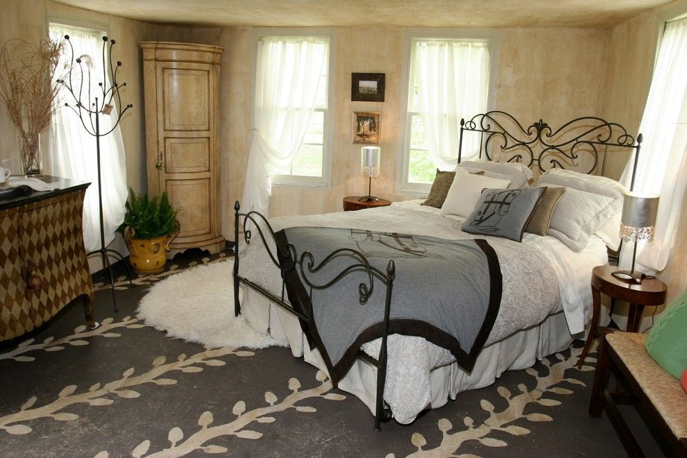 Rodada tapetes e as mesas circundam a sala visualmente para não focar nos cantos. Use acessórios para dar cor ao espaço. Cores arrojadas na cama, cortinas, arte e outros elementos adicionam textura e expressividade ao geral o design do seu quartotirando os olhos das paredes da esquina.