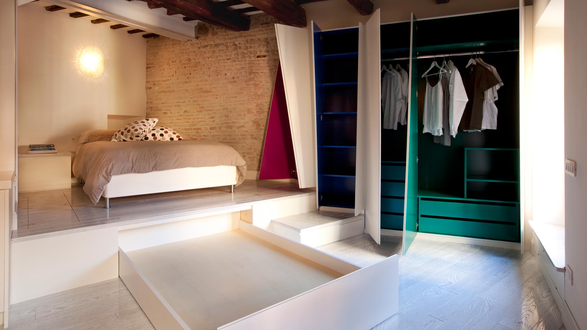 A qualidade única deste guarda-roupa é que ele usa uma combinação da mesma gama de cores com as paredes, que visualmente expande a sala e "esconde" a angularidade excessiva. Usando uma combinação de madeira natural e painéis de cores para expansão visual adicional é um truque favorito dos designers ultimamente. Construa-o até o teto para criar uma aparência holística e acomodar muitos cofres.