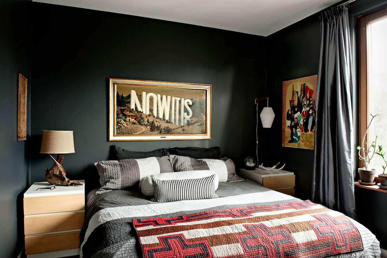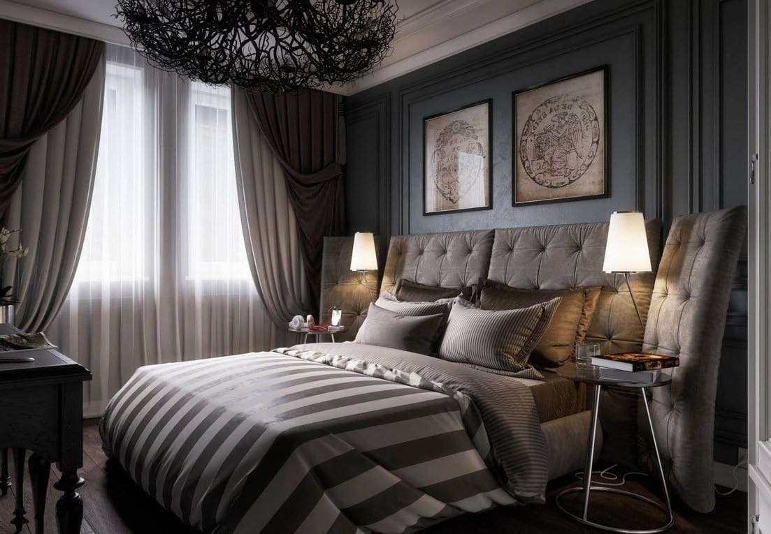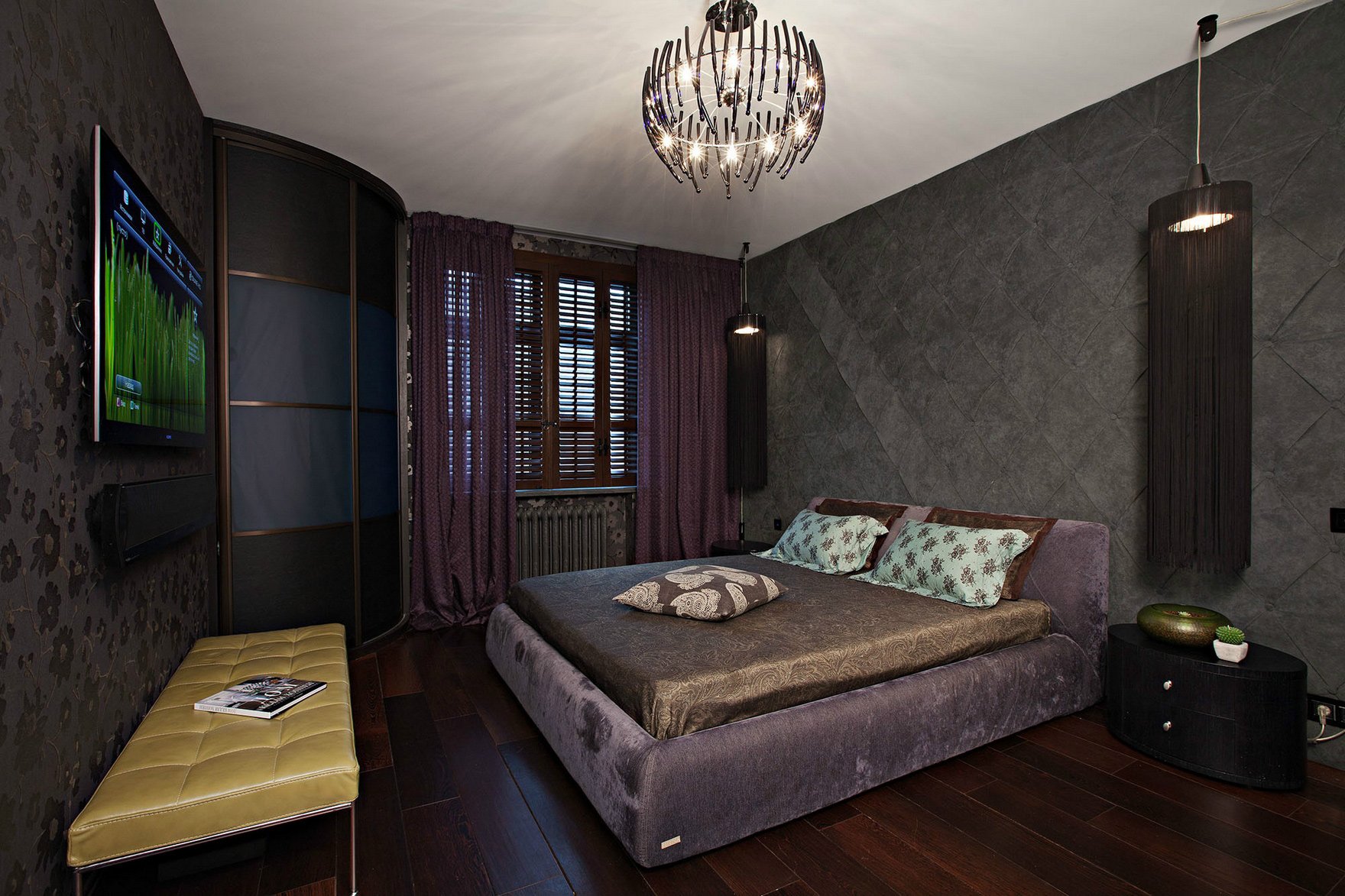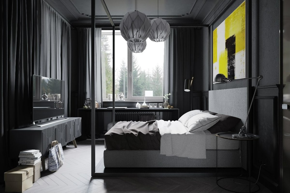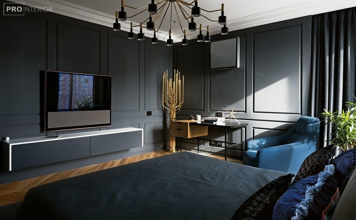 A principal tarefa da sala é criar um ambiente agradável para um bom sono e descanso. Portanto, muitos nem sequer pensam em como organizá-lo em uma paleta escura.