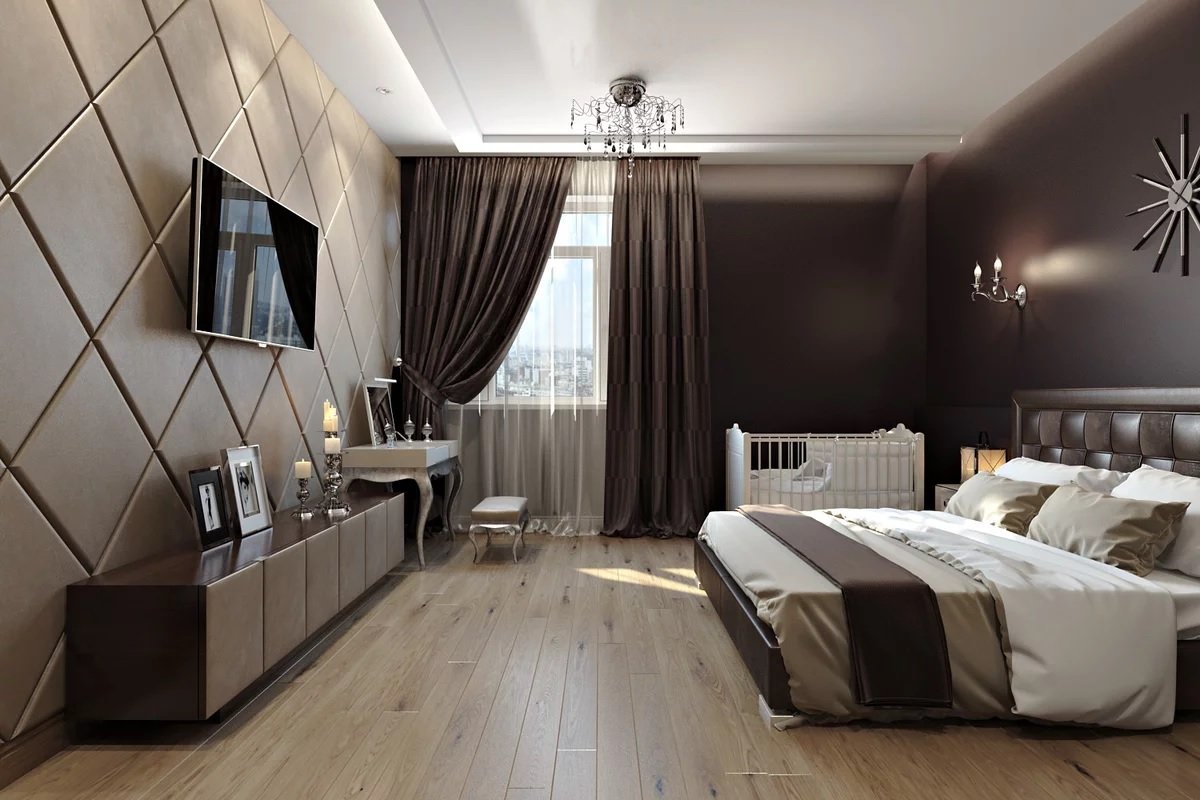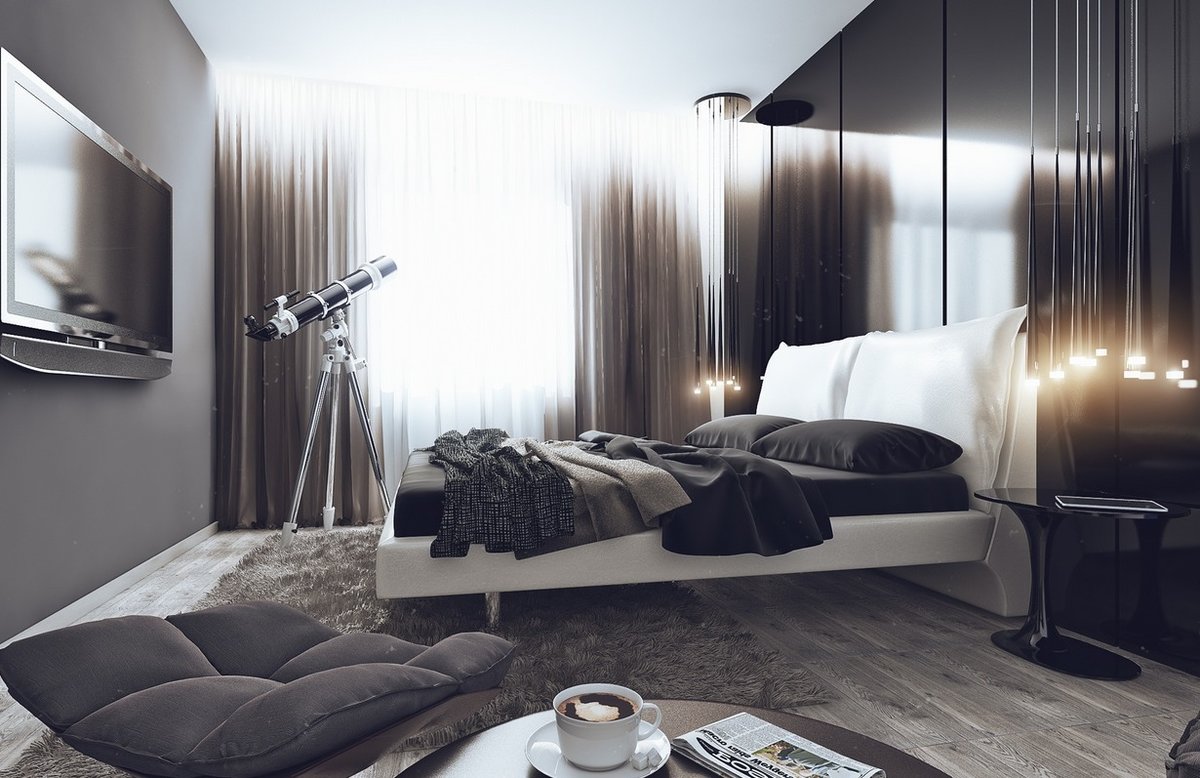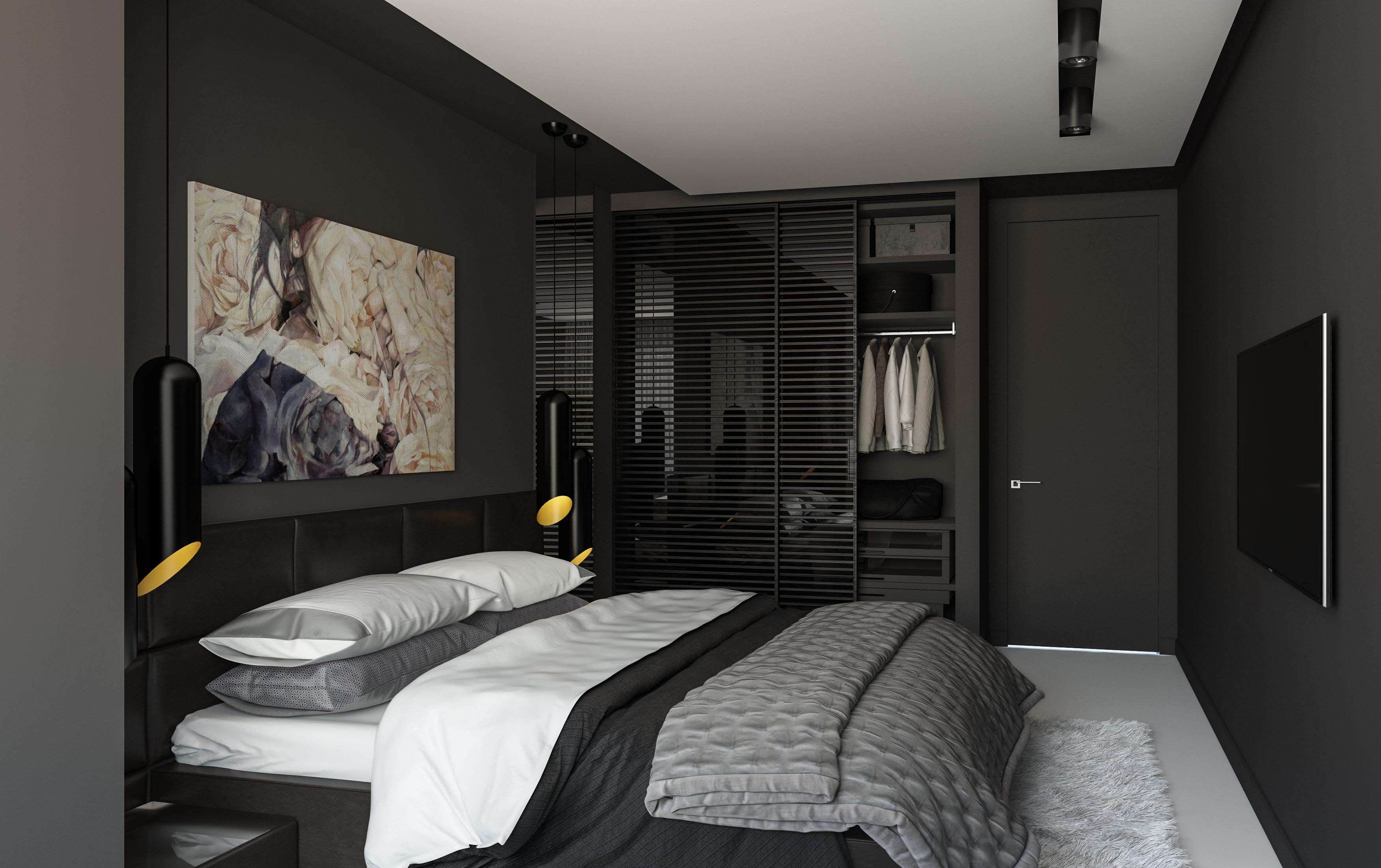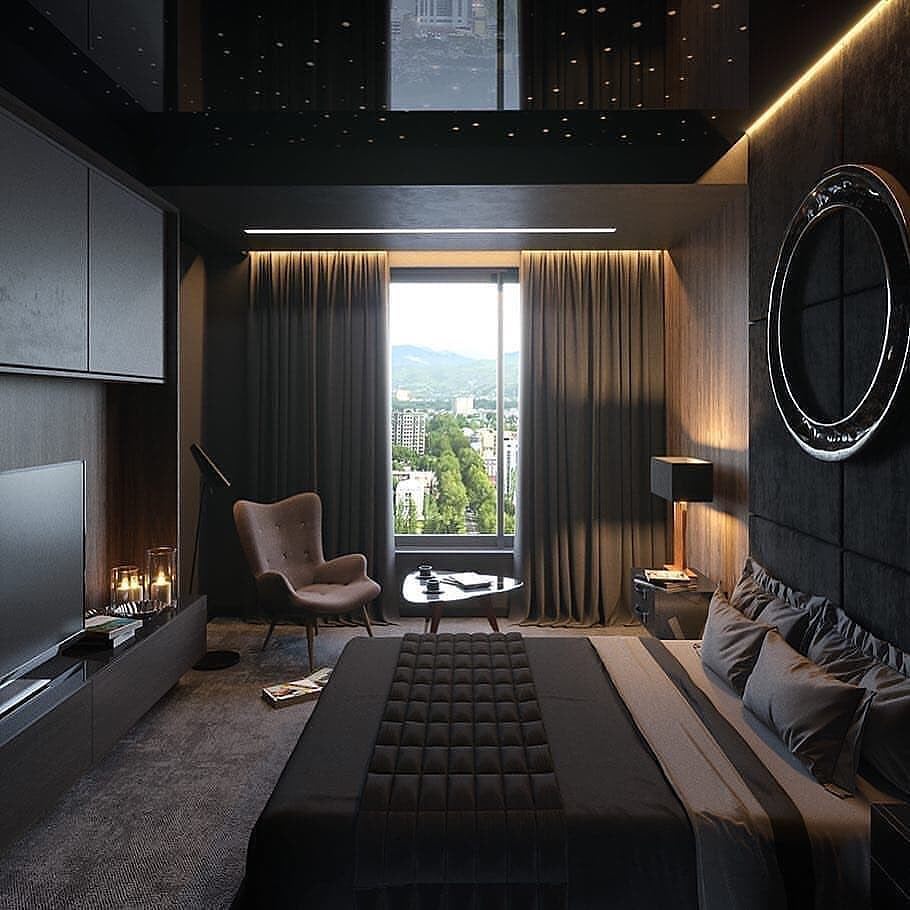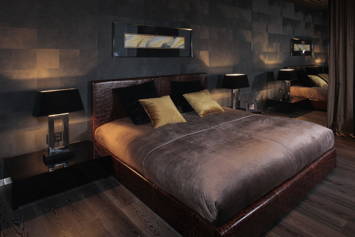 A principal tarefa da sala é criar um ambiente agradável para um bom sono e descanso. Portanto, muitos nem sequer pensam em como organizá-lo em uma paleta escura.