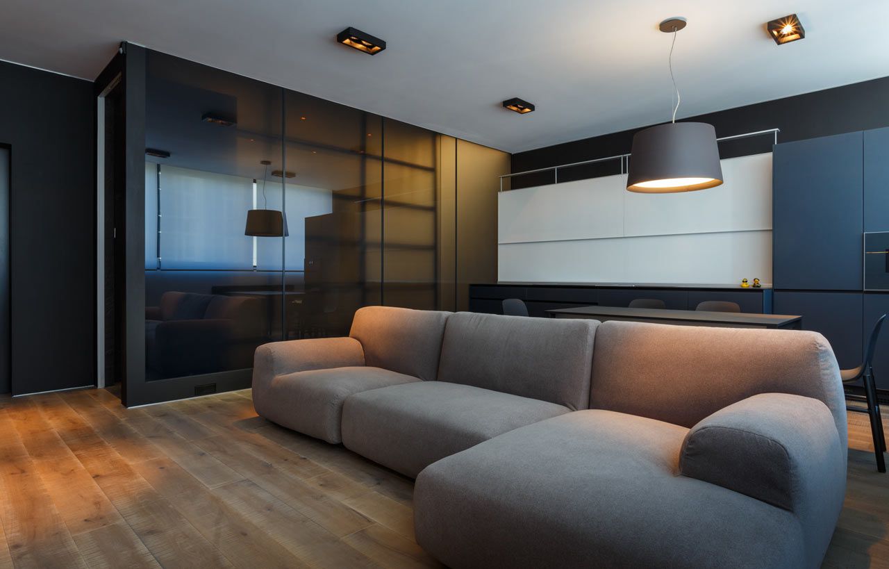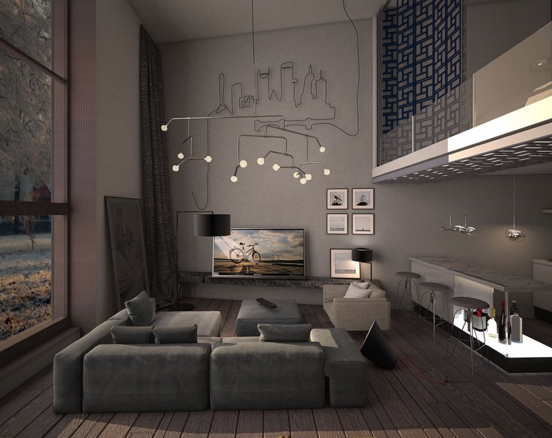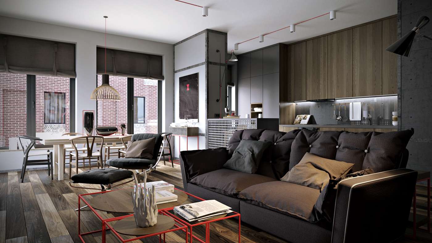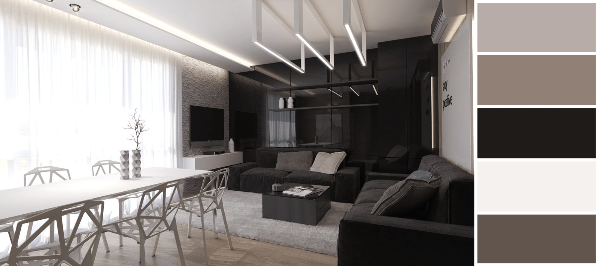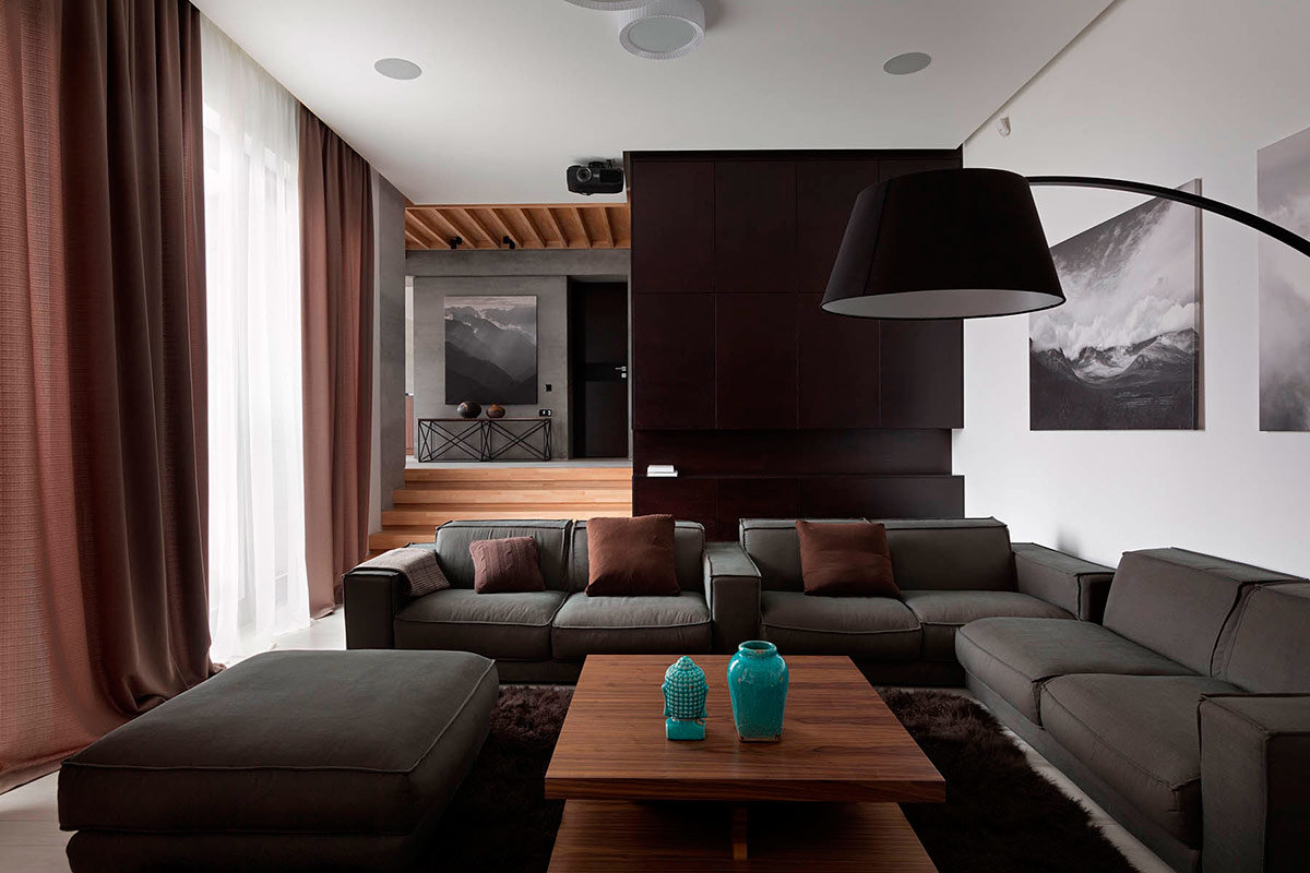 Para o interior do apartamento, feito em uma paleta escura, olhou organicamente, recomenda-se pensar em toda a situação da sala com antecedência. Isso ajudará a criar harmonia na casa.