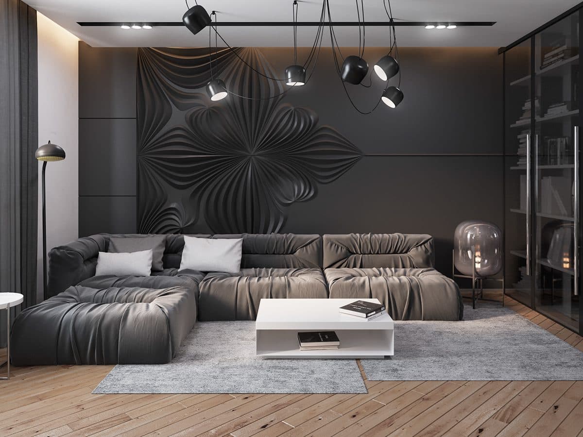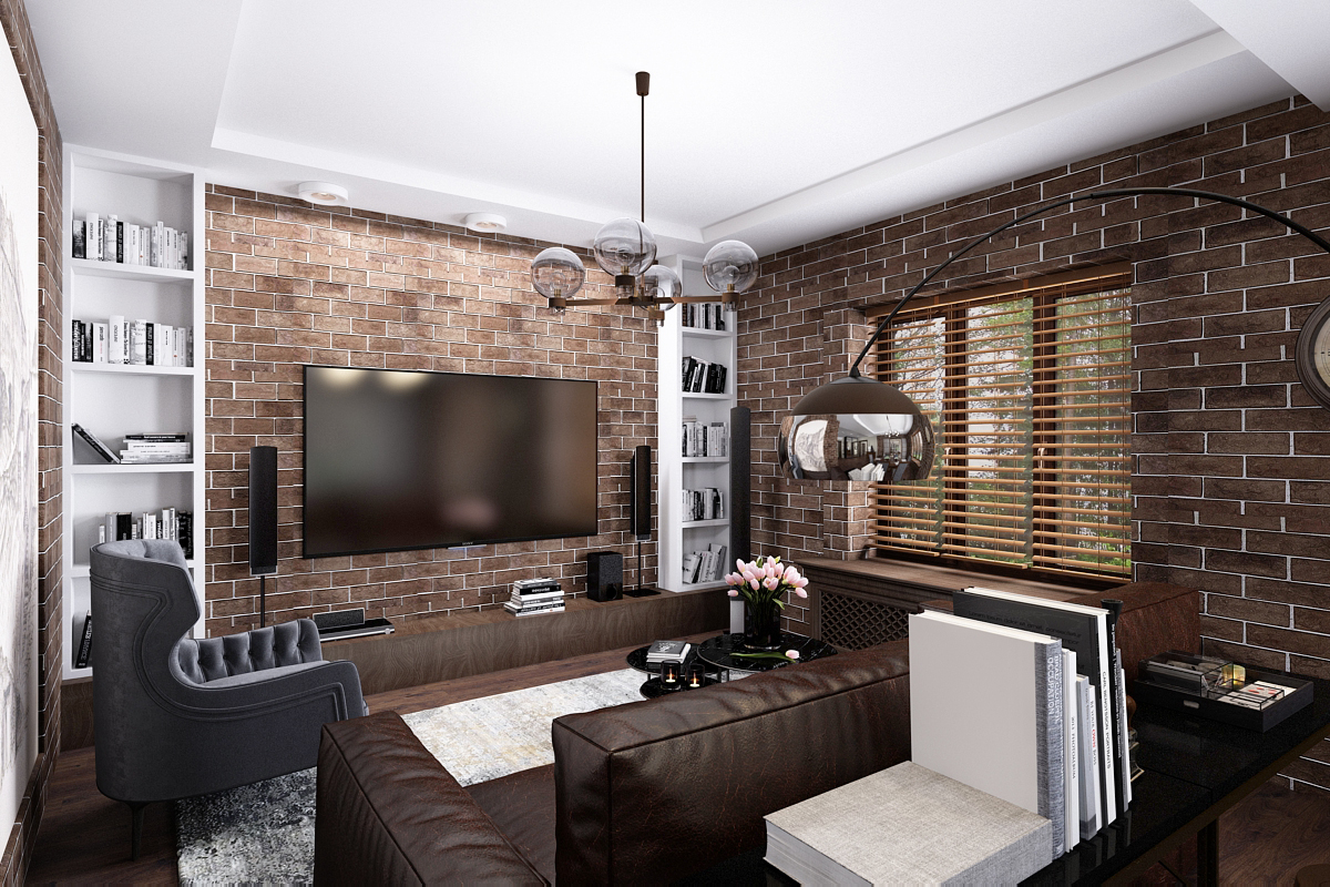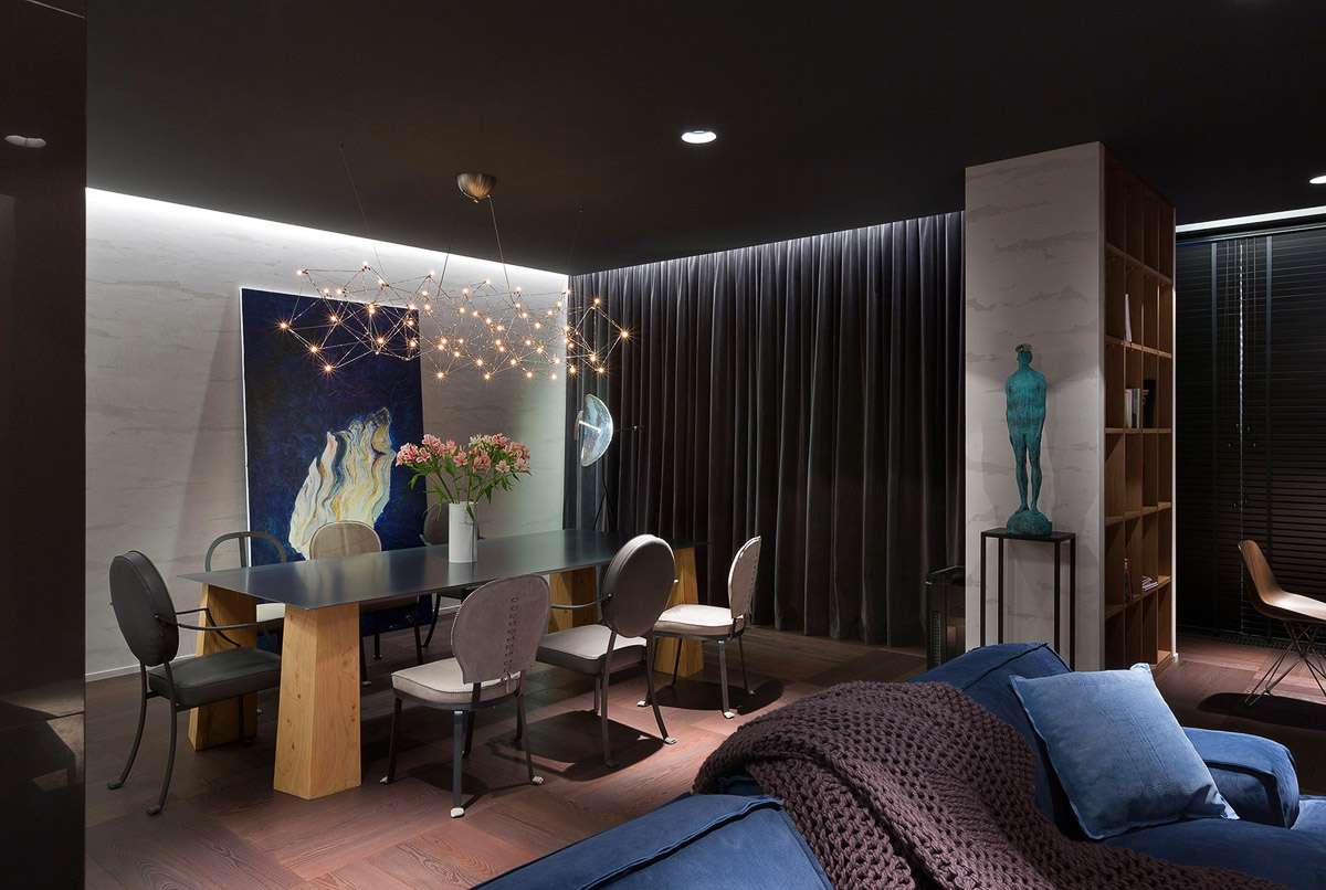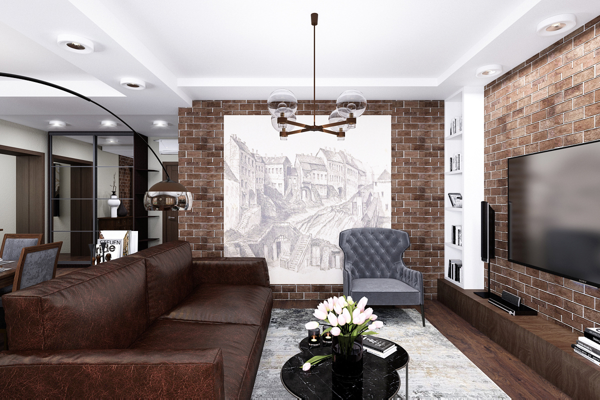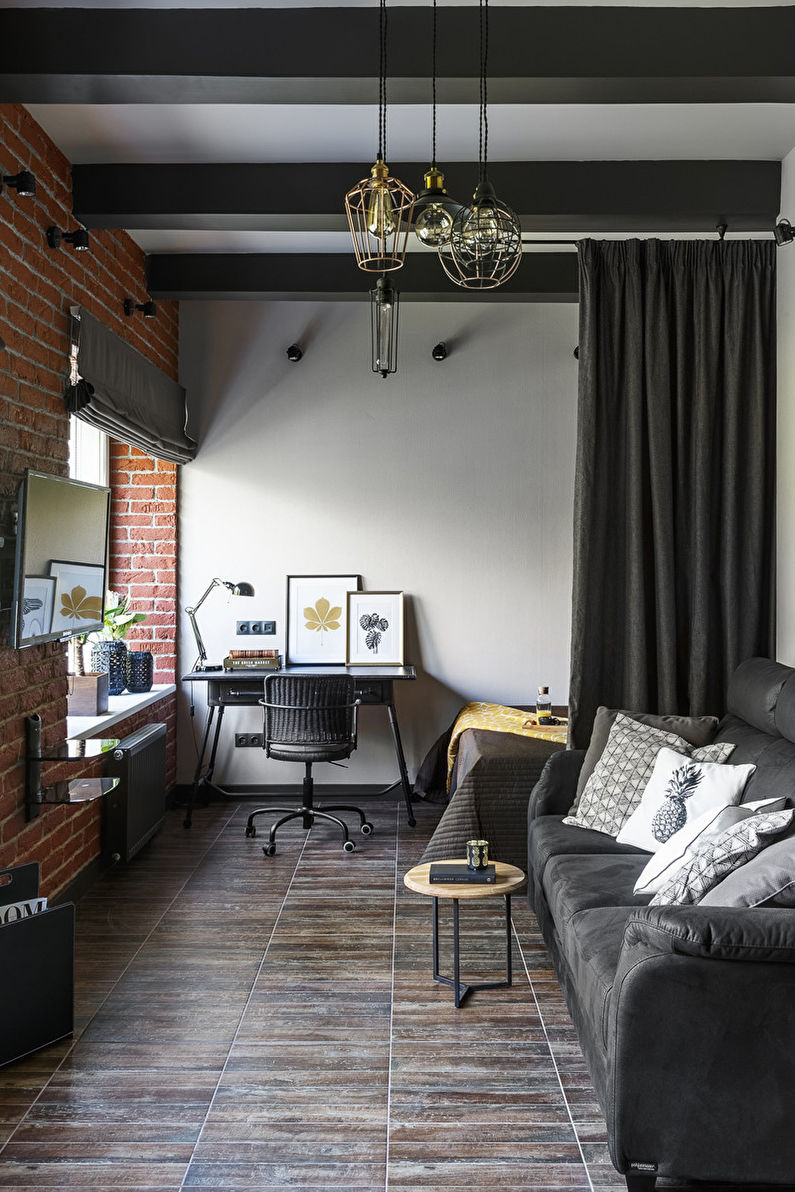 Para o interior do apartamento, feito em uma paleta escura, olhou organicamente, recomenda-se pensar em toda a situação da sala com antecedência. Isso ajudará a criar harmonia na casa.