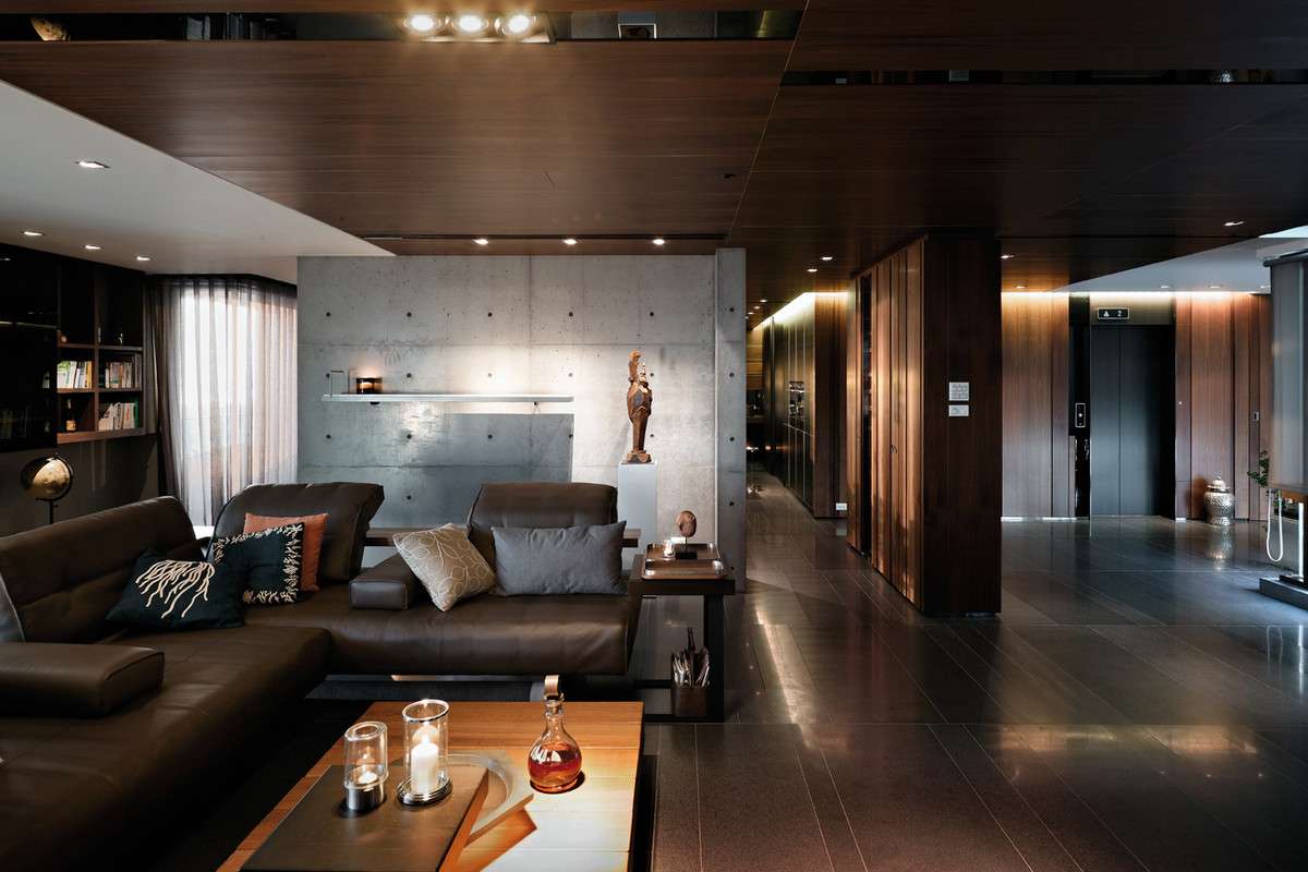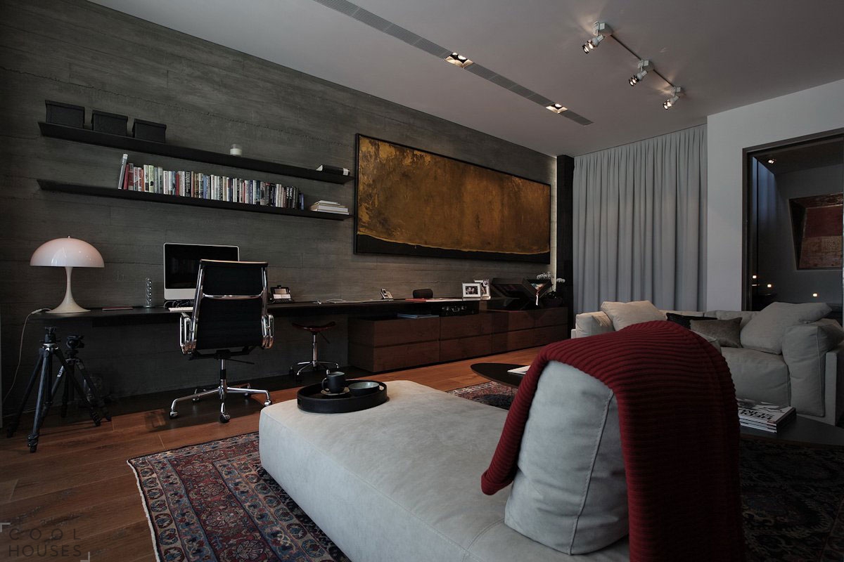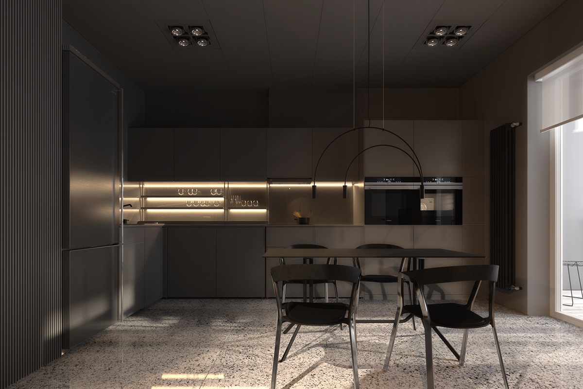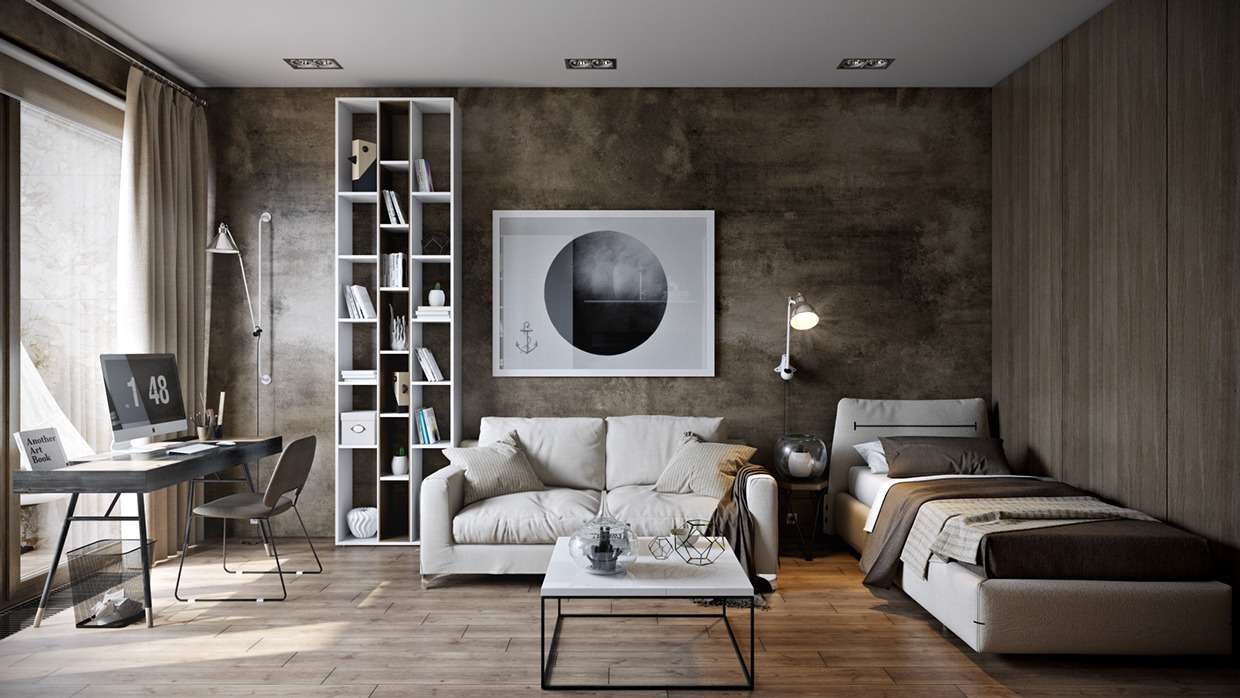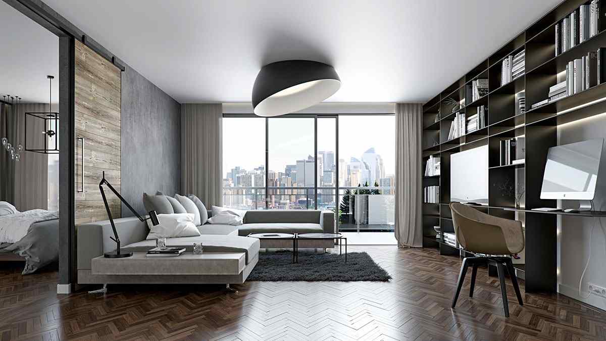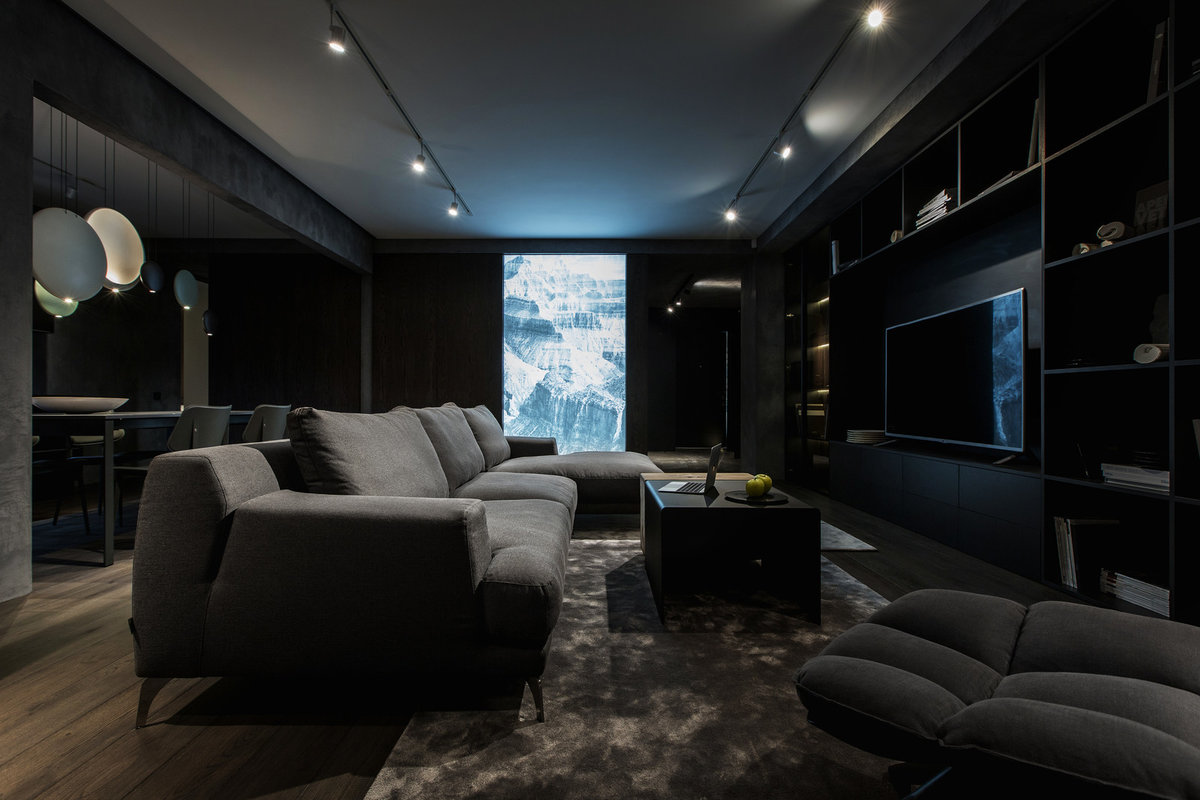 Para o interior do apartamento, feito em uma paleta escura, olhou organicamente, recomenda-se pensar em toda a situação da sala com antecedência. Isso ajudará a criar harmonia na casa.