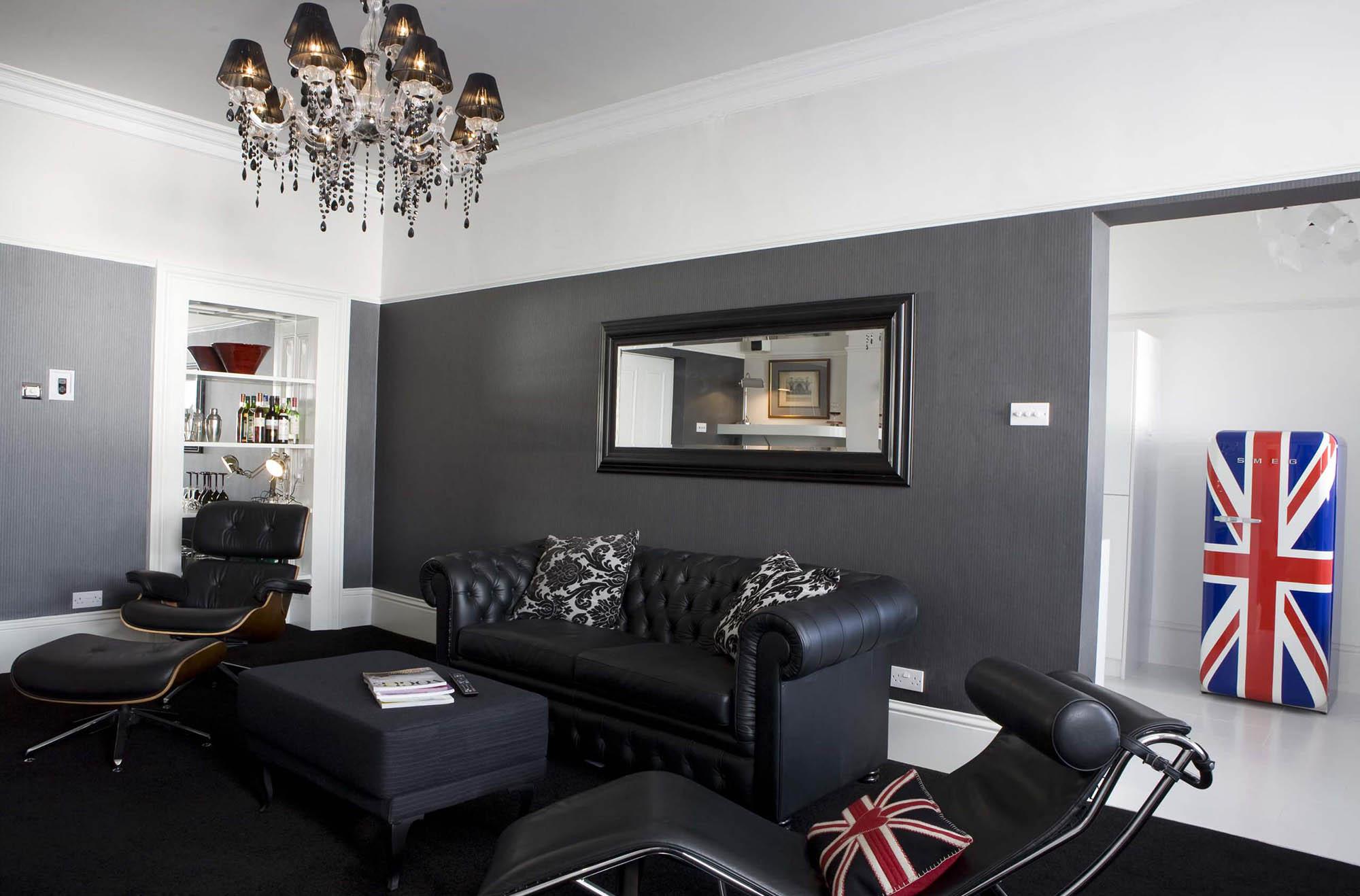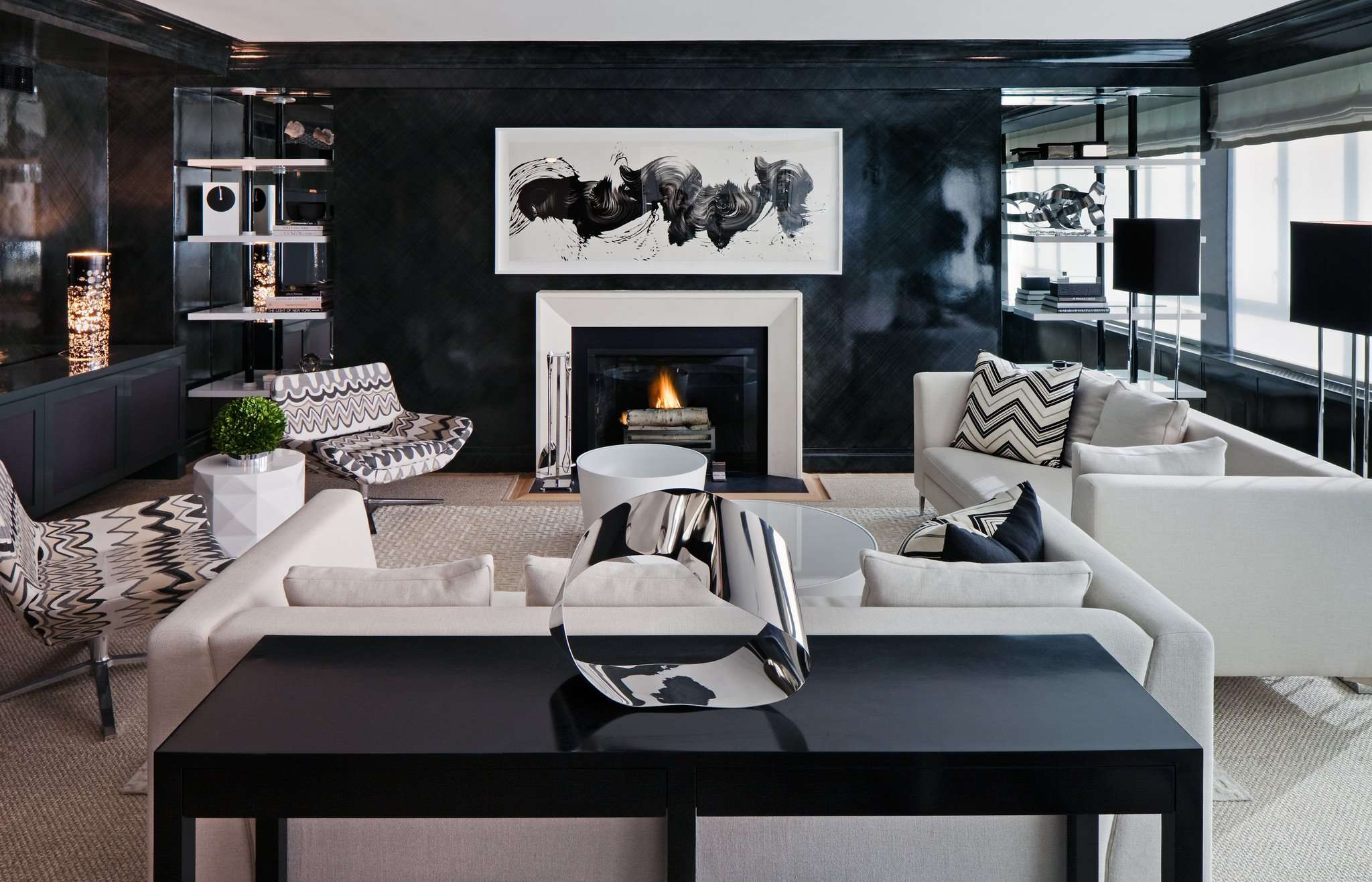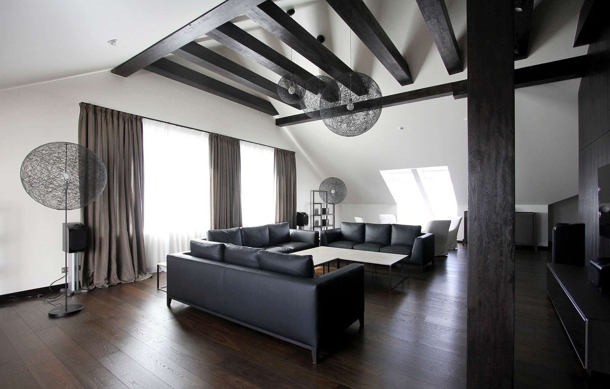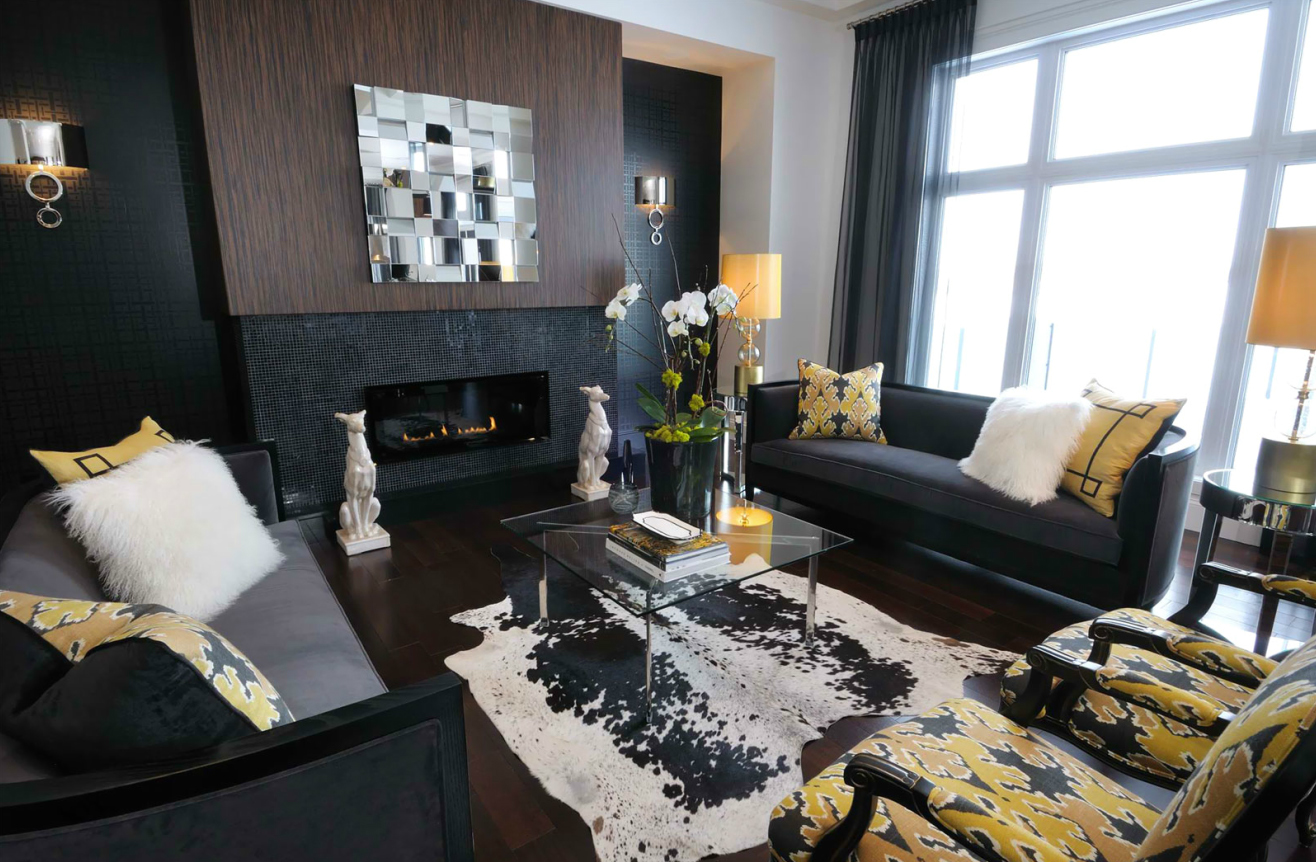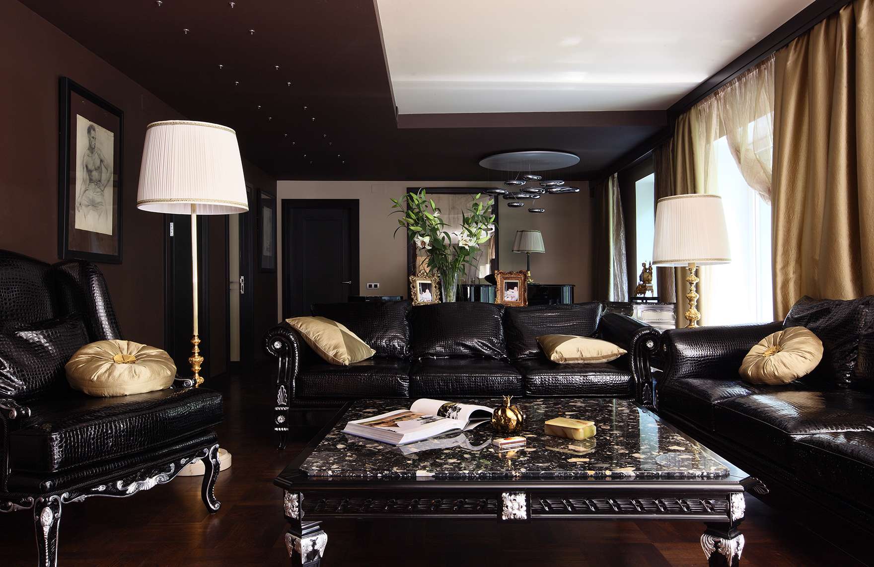 - Para uma sala grande, o preto é usado como o tom principal. Seus muitos presentes na decoração das paredes. O principal é antecipadamente pensar sobre os móveis, tecidos e acentos principais da sala, a fim de evitar melancolia.