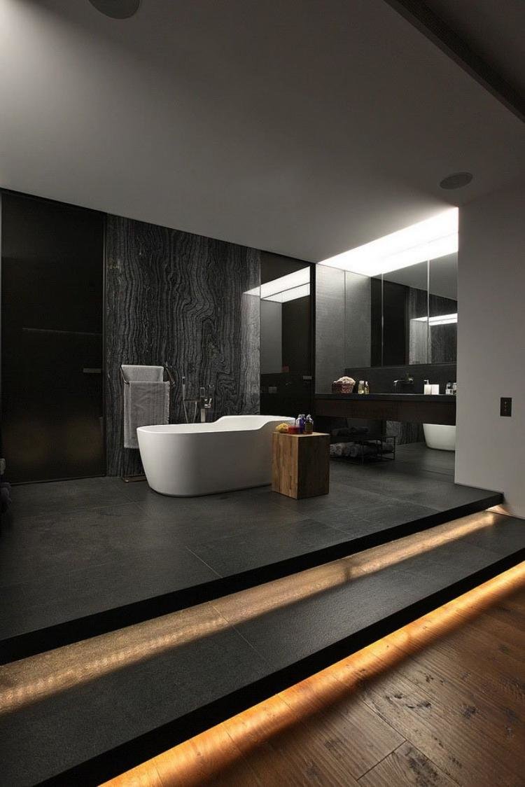 Uma sala cheia de cores escuras torna-se luxuosa e elegante. Tom preto, que está presente no banheiro, combinado com quase todas as cores.