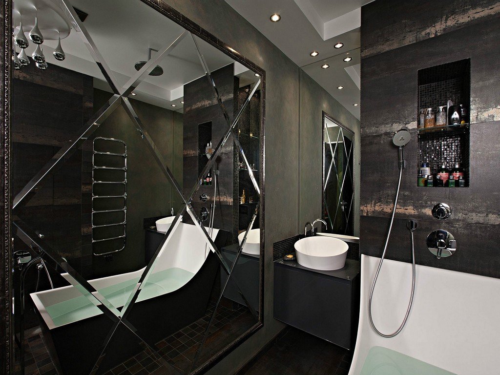 Para criar um efeito adicional de luxo e riqueza, você pode usar um espelho preto telhas. Antes de escolhê-lo, você precisa entender que tal acabamento requer cuidados especiais. Nele serão claramente visíveis gotículas de água depois de tomar um banho. Portanto, limpar esta sala deve ser muito mais frequente e especialmente cuidadoso.