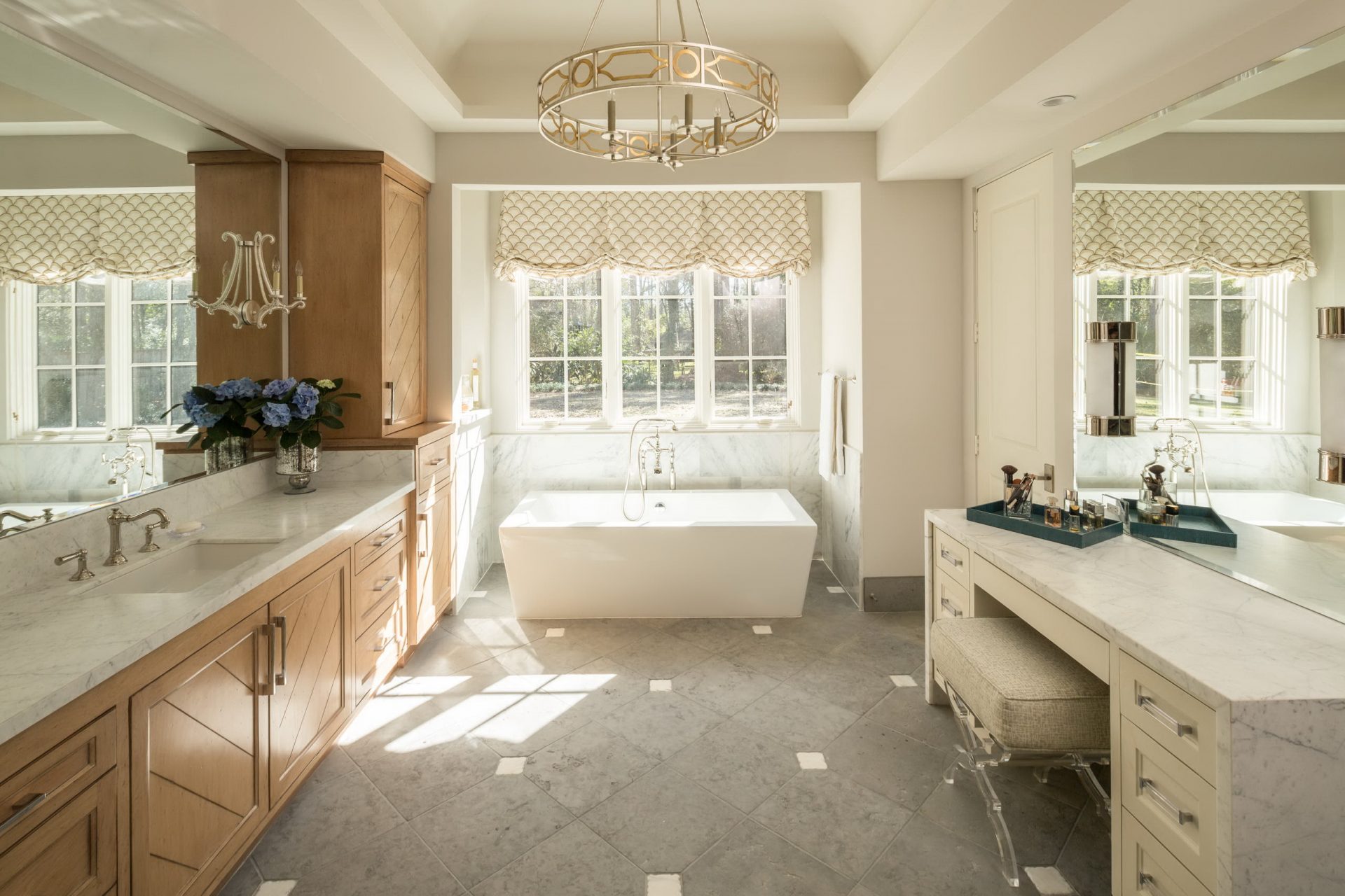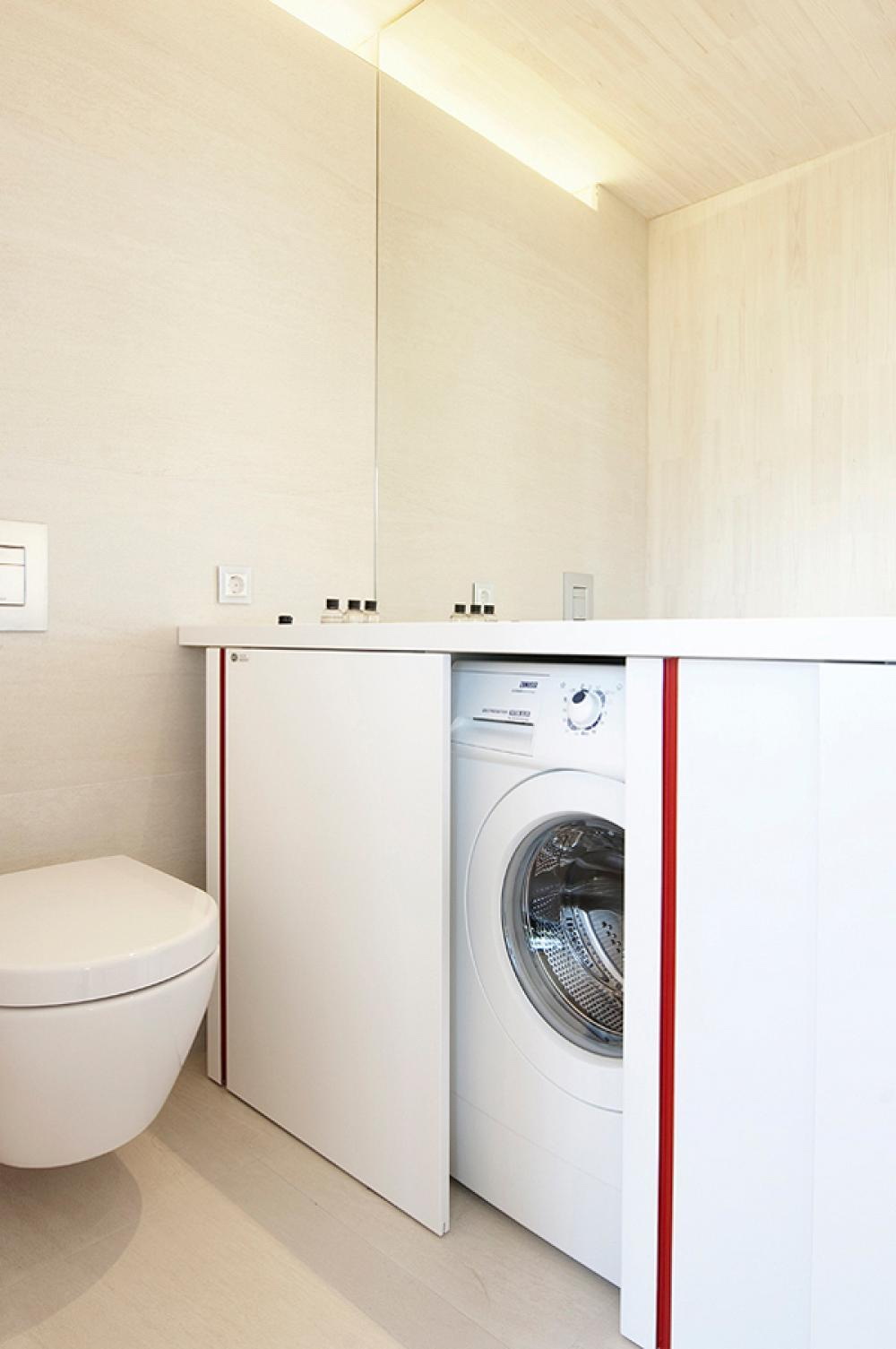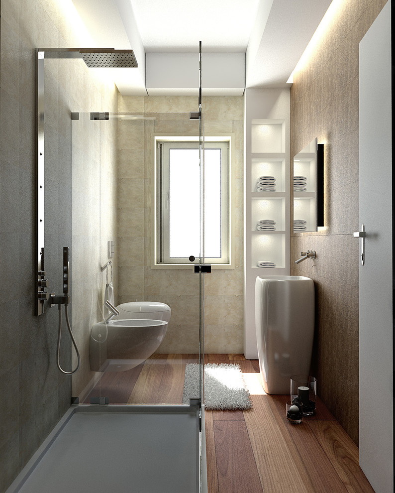 Muitos recomendam alocar uma sala separada do banheiro para que não tenha mobília extra (armários de linho, eletrodomésticos, etc.). Deixe um máximo de espaço livre no banheiro.
