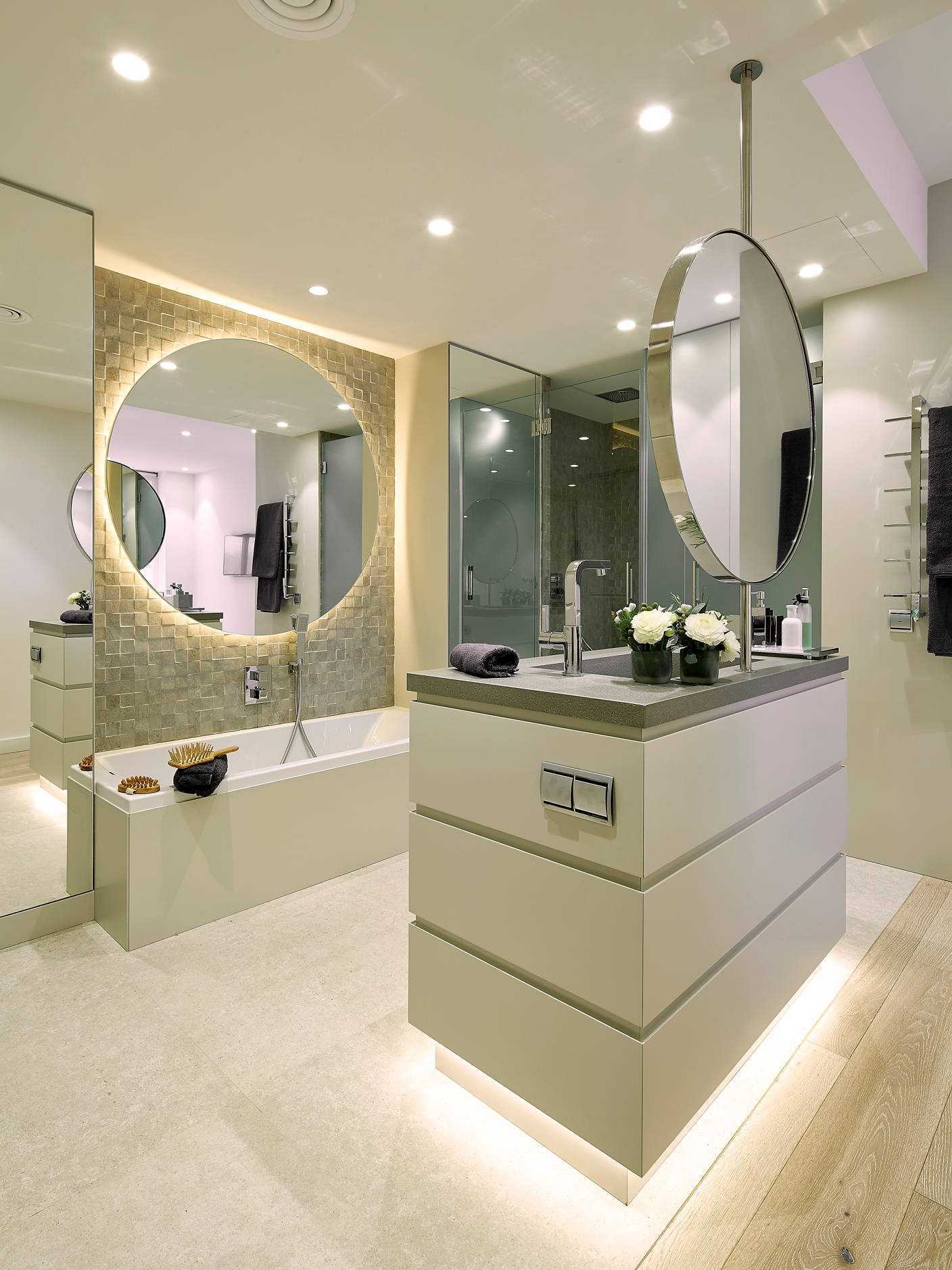 A melhor opção para iluminação de casas de banho - projectores de halogéneo. Eles são adequados para iluminar toda a superfície, ajudam a zona do espaço. Não ocupe espaço. Os sofitos parecem dentro de casa harmoniosamente, porque toda a fiação está escondida atrás do teto suspenso (isso garante proteção da fiação contra umidade).