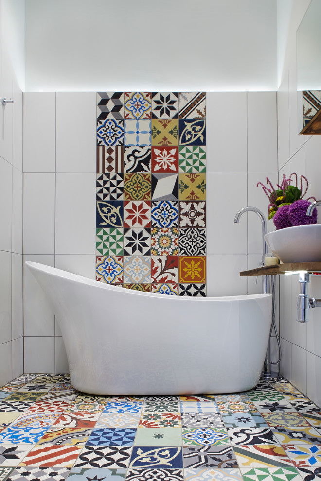Telha - a versão clássica. Uma variedade de azulejos para o banheiro (cerâmica, porcelana, mosaico, etc.). Nós já mencionamos acima sobre o zoneamento de uma sala com a ajuda de uma telha. Combinando vários materiais de acabamento ao mesmo tempo, uma opção prática e esteticamente atraente.