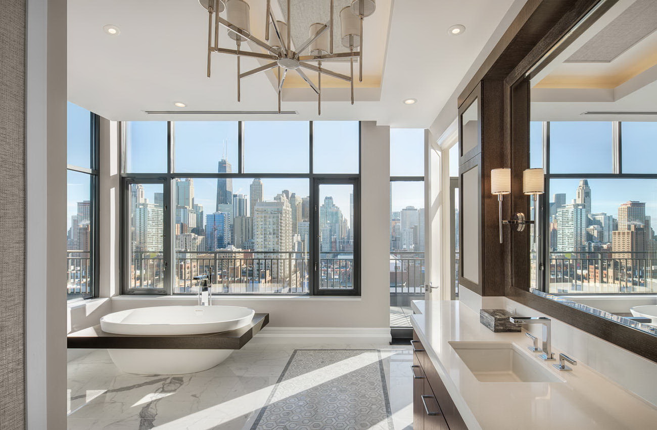 Para acomodar uma área grande, você pode escolher um banheiro de canto ou colocá-lo no meio da sala.