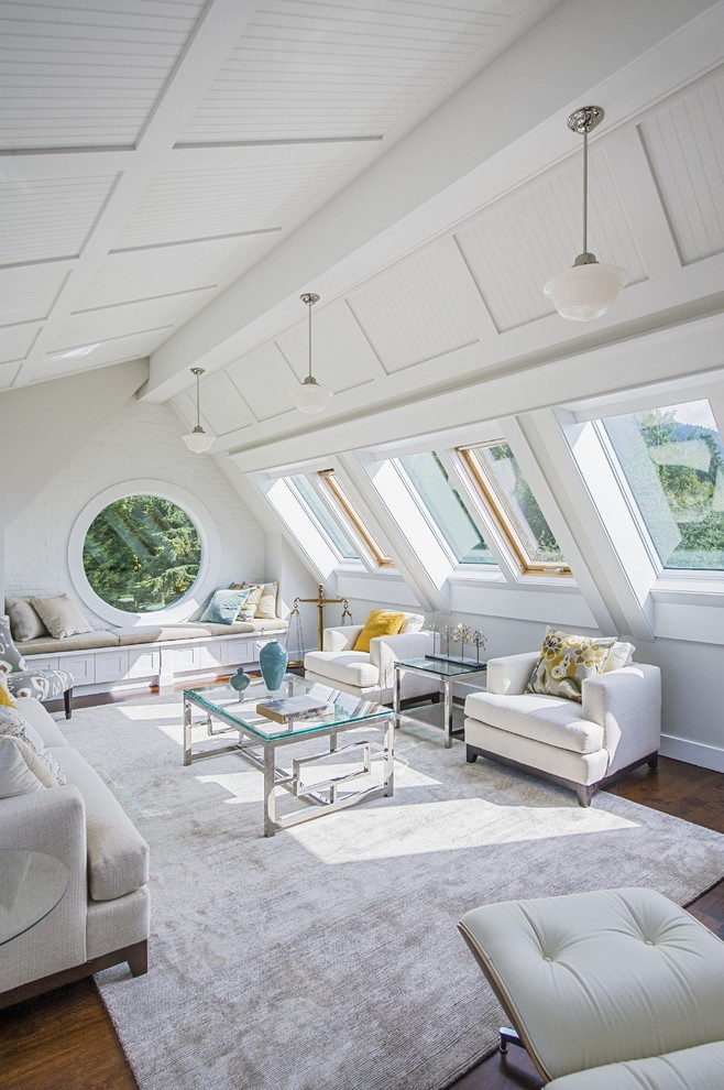 Se você não pode instalar um completo as janelas, você precisa cuidar de uma boa iluminação. Assim, segurança e conforto são garantidos. A organização da iluminação depende das funções dos quartos, que estão localizados no sótão. Você planejou os quartos, incluindo os quartos de hóspedes, então há um suficiente candelabro, lâmpadas noturnas e iluminação no teto.