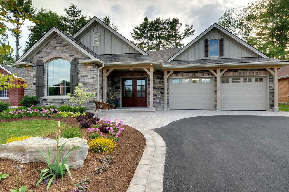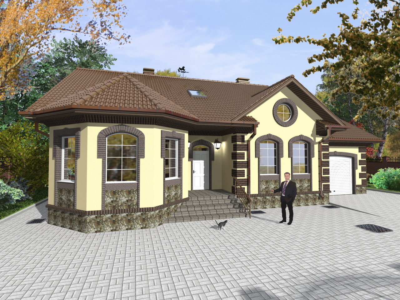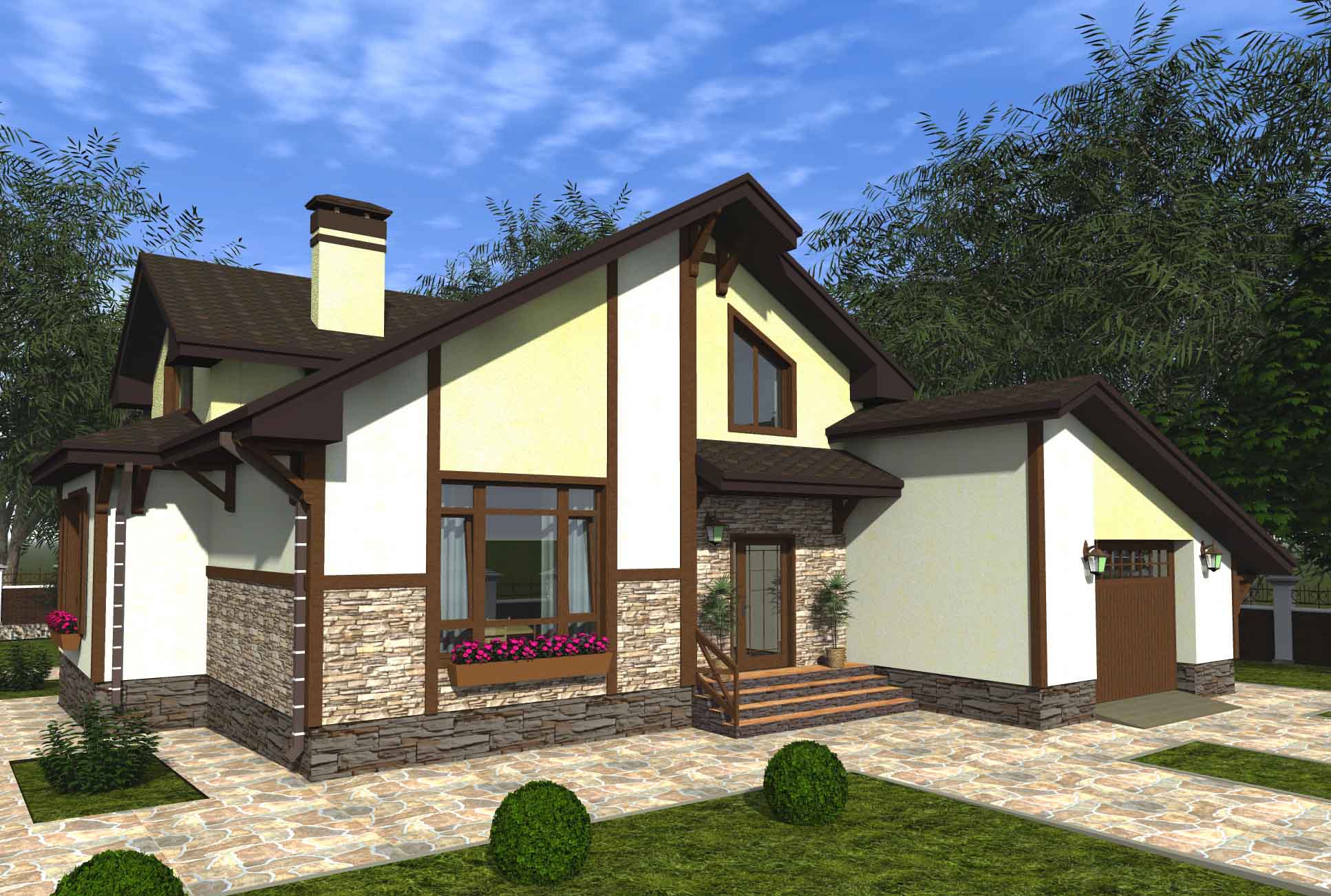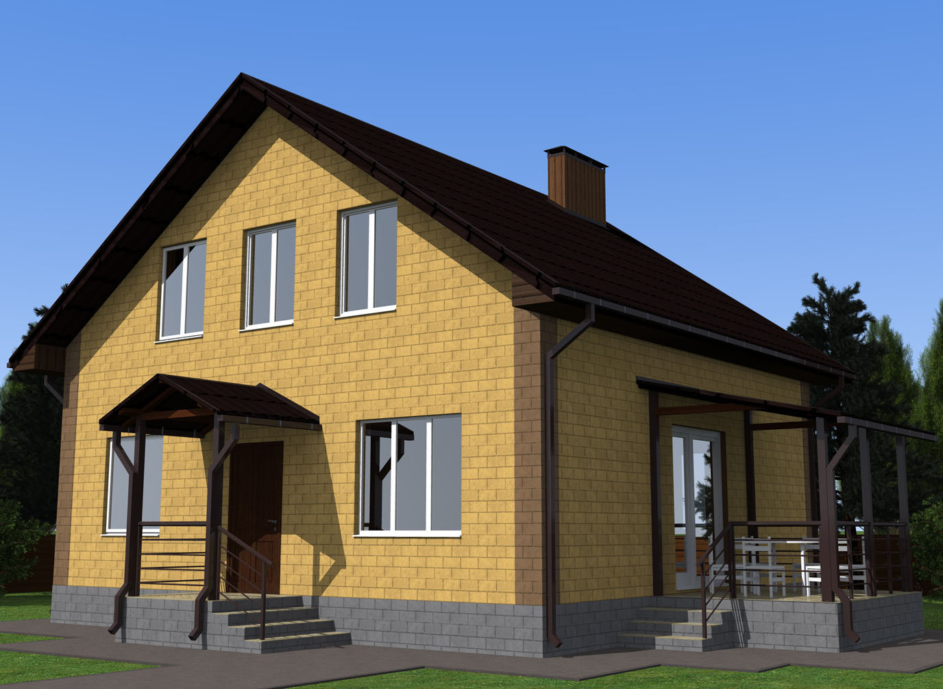 Que a casa não parecesse chata, aplique modelos de diferentes texturas, cores, tamanhos. Por exemplo, os cantos, o enquadramento das janelas das portas são decorados com tijolos escuros e a parte principal é leve. Amantes da criatividade, um pouco de fantasia.