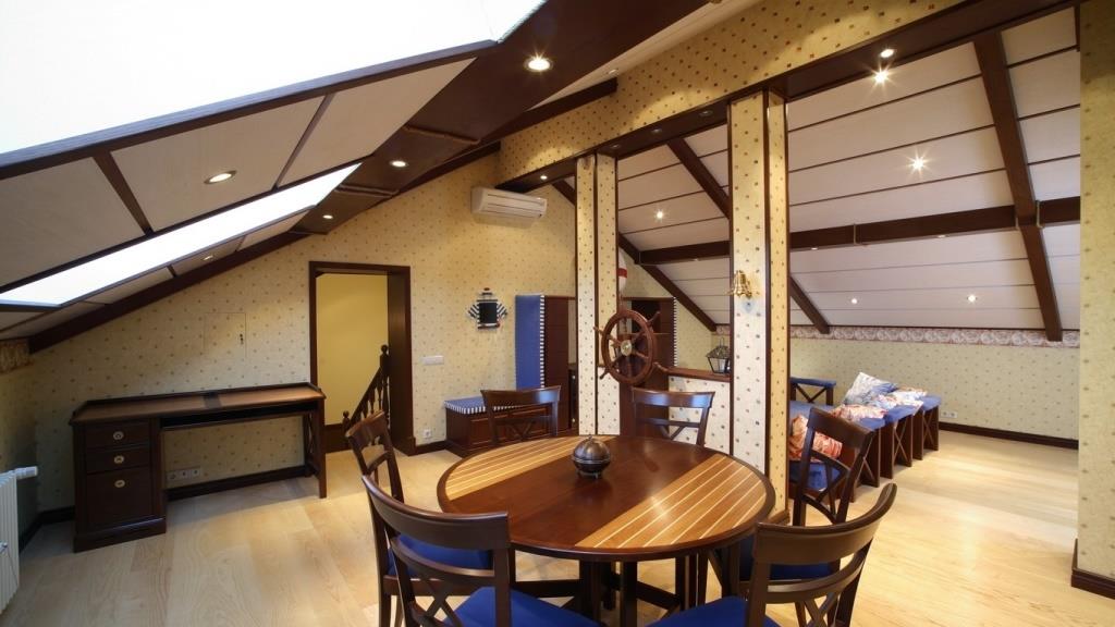 Deve ser lembrado que o sótão é parte do espaço vital da casa. Portanto, escolher materiais de acabamento e direção não pode tomar decisões radicais.. Como opção, o primeiro andar é decorado em um dos estilos: hi-tech, minimalismo, japonês, kitsch. Você queria fazer o top um original e decidiu decorá-lo no estilo do quarto de Madame Pompadour - azul com ouro, um grande número de detalhes elaborados. Resultado: diversas instalações não estarão em harmonia umas com as outras.