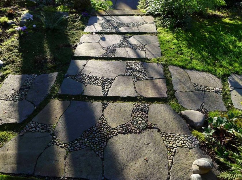 - Pedra selvagem. Chamados de ladrilhos feitos de pedra natural, que não são feitos para moldar, mas pela forma como a pedra se quebrou.Padrões com eles não funcionarão e, para formar uma trilha, você terá que fazer um esforço. Para facilitar o trabalho, você pode primeiro segurá-lo no papel.