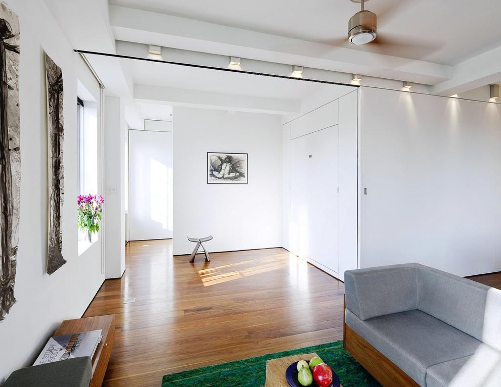 Na maioria das vezes, essas portas são usadas para alocar um "vestiário" separado na sala - um local onde os residentes do apartamento e os hóspedes trocam de roupa e também para guardar roupas. É mais fácil e mais conveniente criar uma área de vestimenta de forma longa e estreita o corredor (corredor).