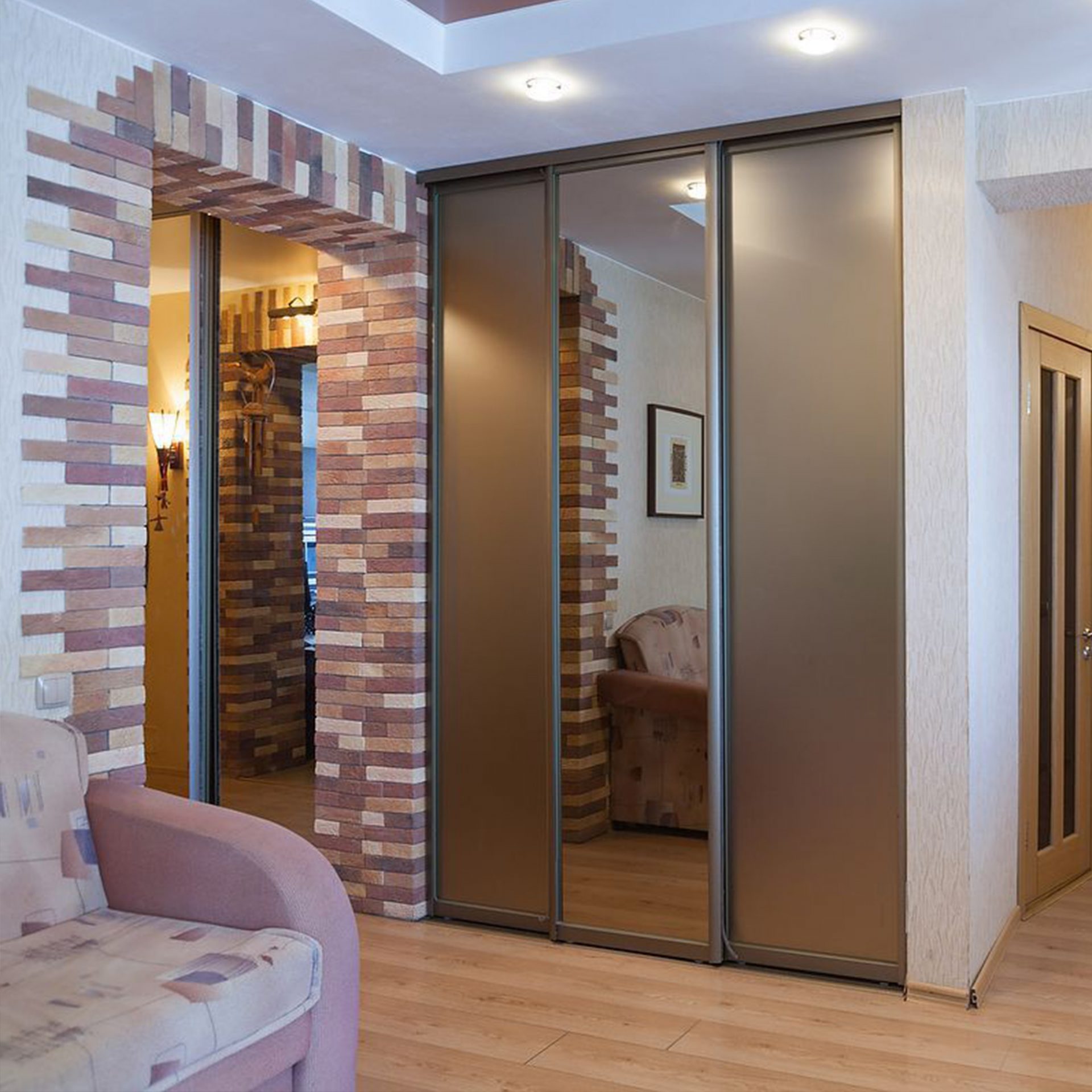 - Se as dimensões da sala não permitirem a instalação de portas com inserções de vidro, você pode pedir um guarda-roupa com portas semelhantes de qualquer tamanho e colocá-lo onde você precisa dividir a sala em zonas.