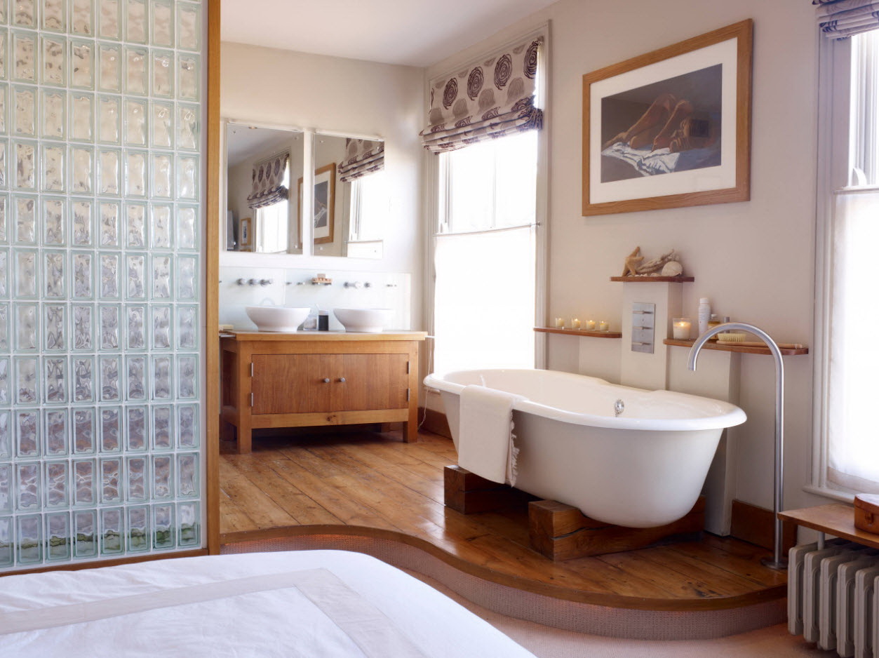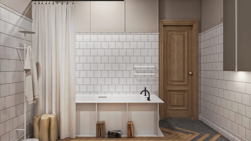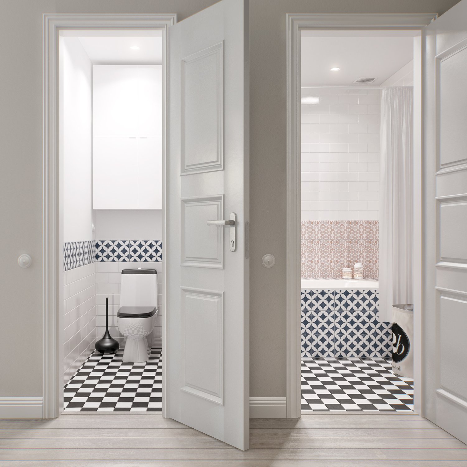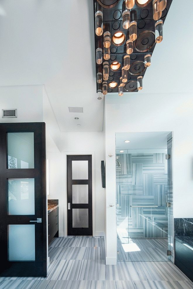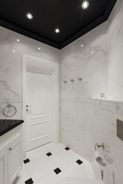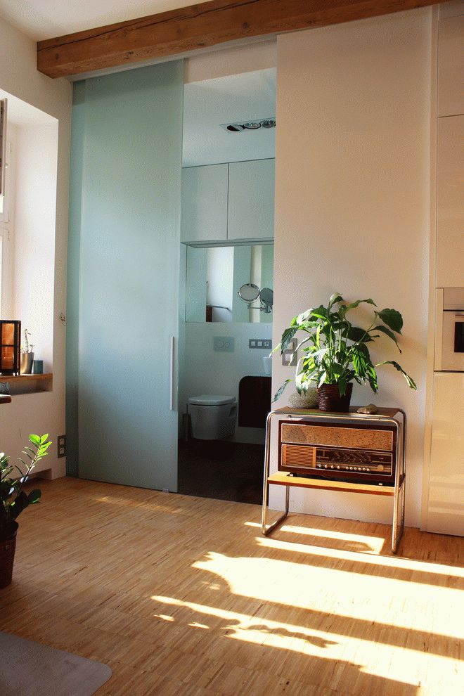 - Para eliminar o risco de inundação, é feito um baixo limiar de 5 cm, evitando que a água entre no salão. Portanto, as dimensões das portas para o banheiro são pequenas, e sua instalação é realizada acima do nível de opções de interiores.