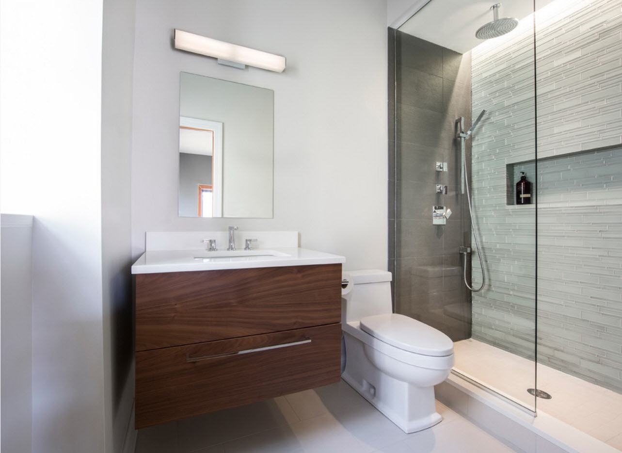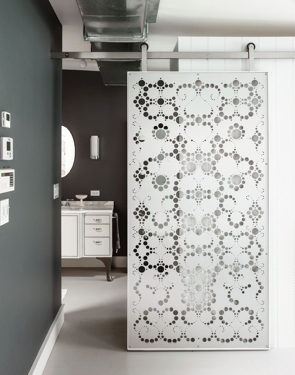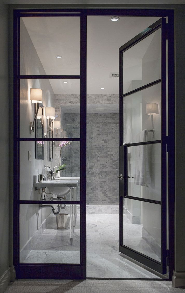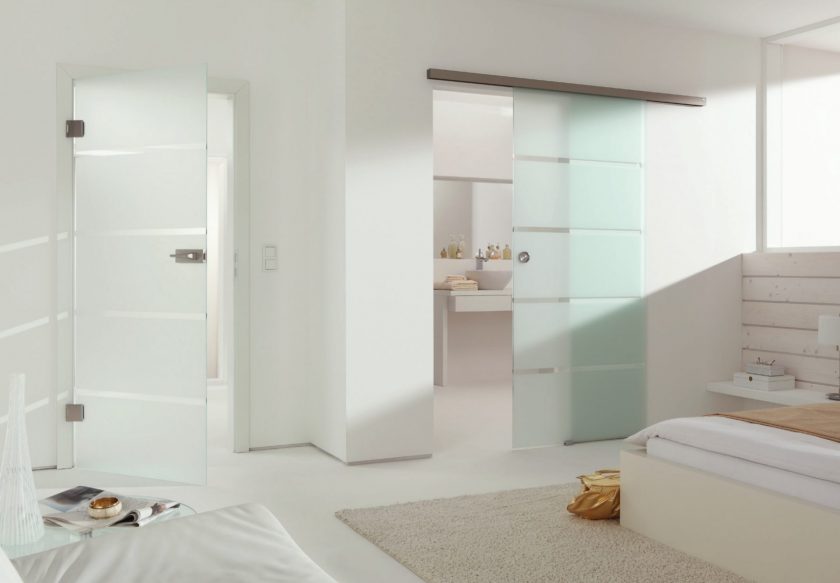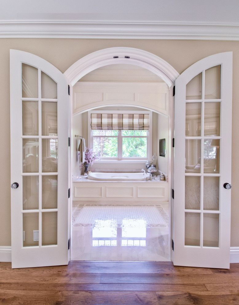 Devido ao fato de que na casa de banho e WC, o nível de umidade é alto, você deve escolher o design de materiais resistentes à umidade. A porta deve ser prática, resistente aos efeitos negativos da umidade. Materiais mais adequados são de vidro, plástico, madeira, MDF e aglomerado.