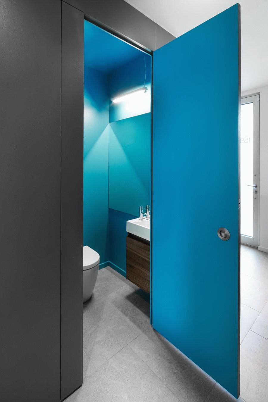 Normalmente, a espessura da parede do banheiro é pequena. Portanto, a moldura da porta deve ser mais espessa em 1,5 cm, para não aumentar a parede.