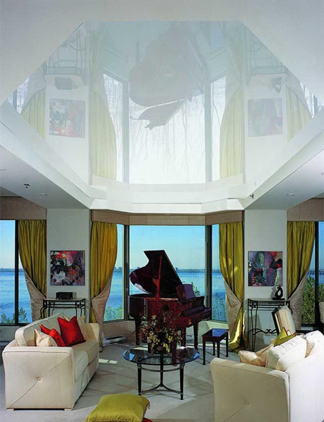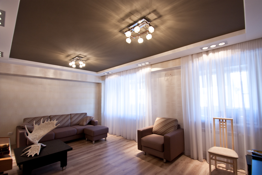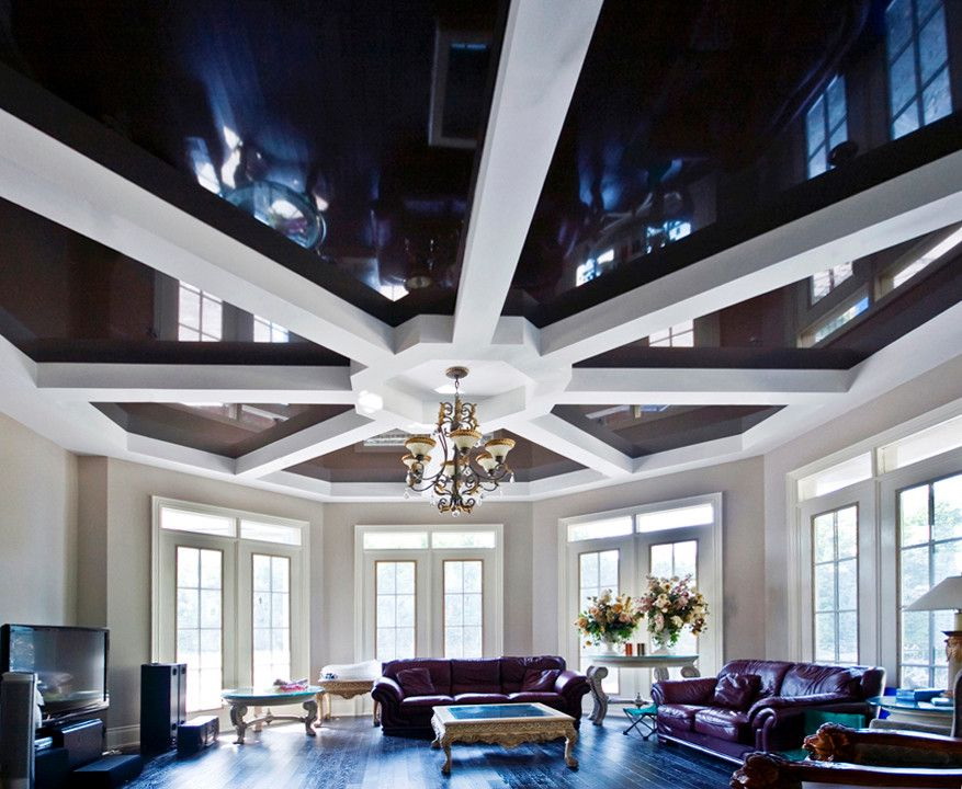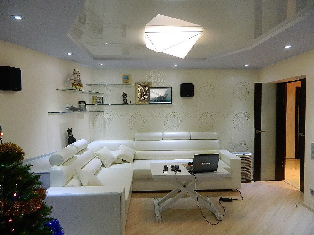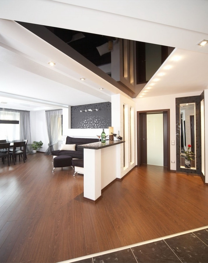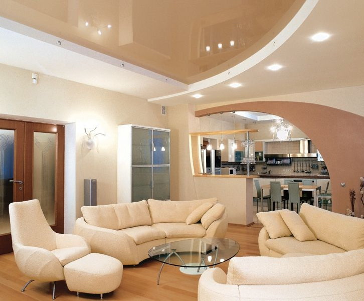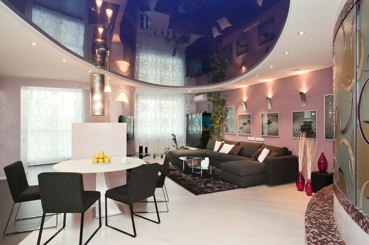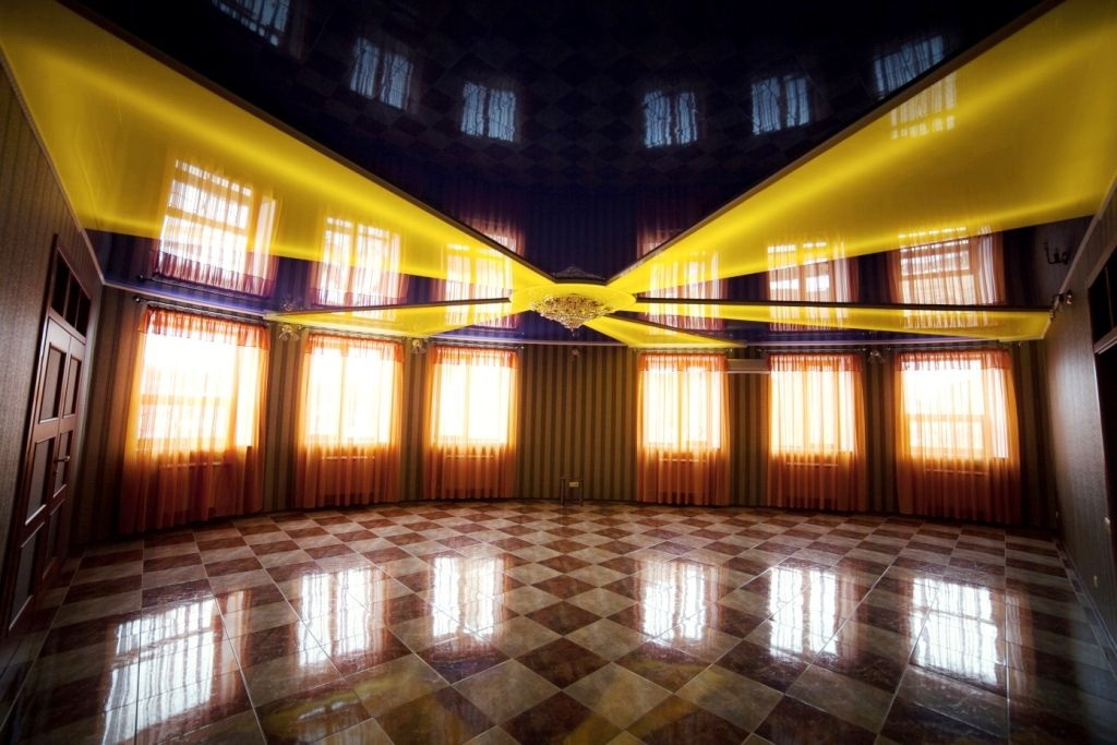 - Suave. A brilhante superfície espelhada de qualquer cor é o teto de filme clássico ao qual todos estão acostumados. Reflete tudo o que acontece abaixo, torna a sala visualmente maior, expande o espaço e parece espetacular.