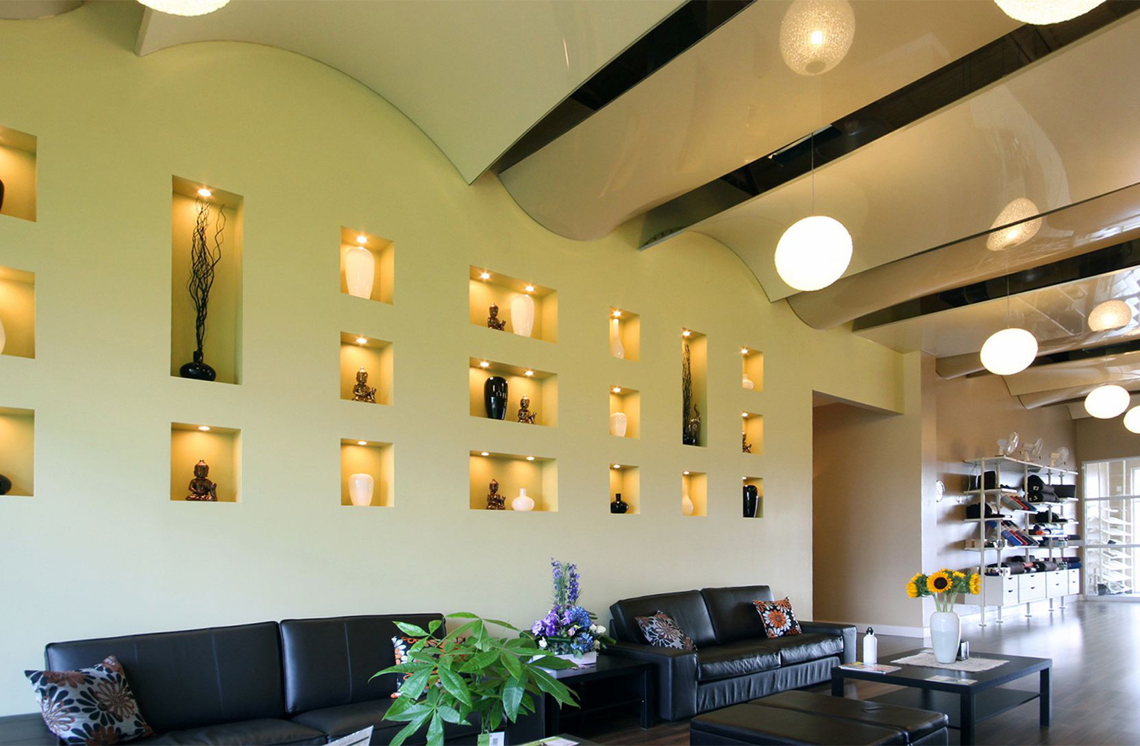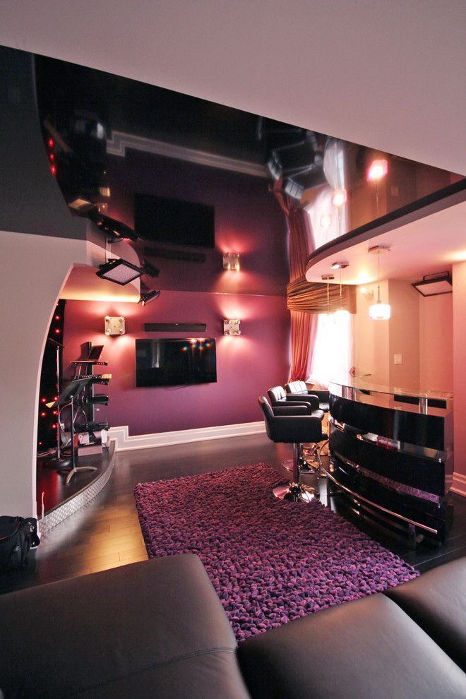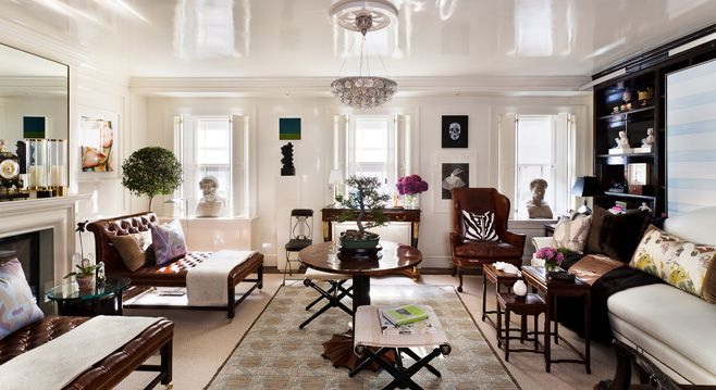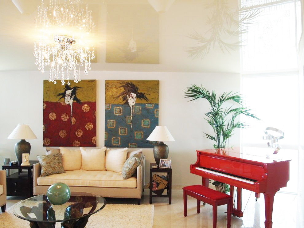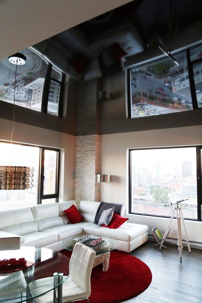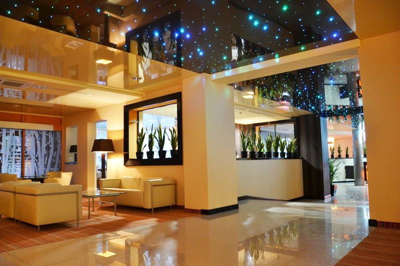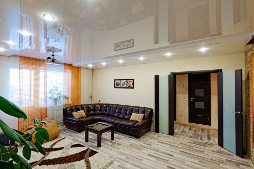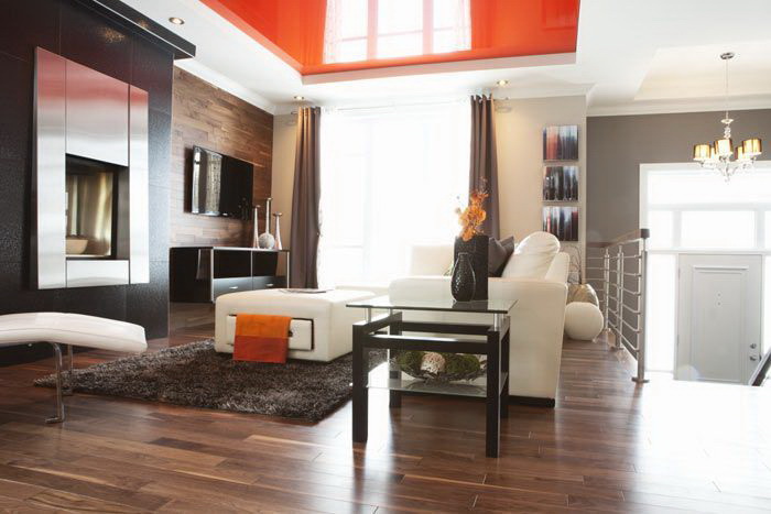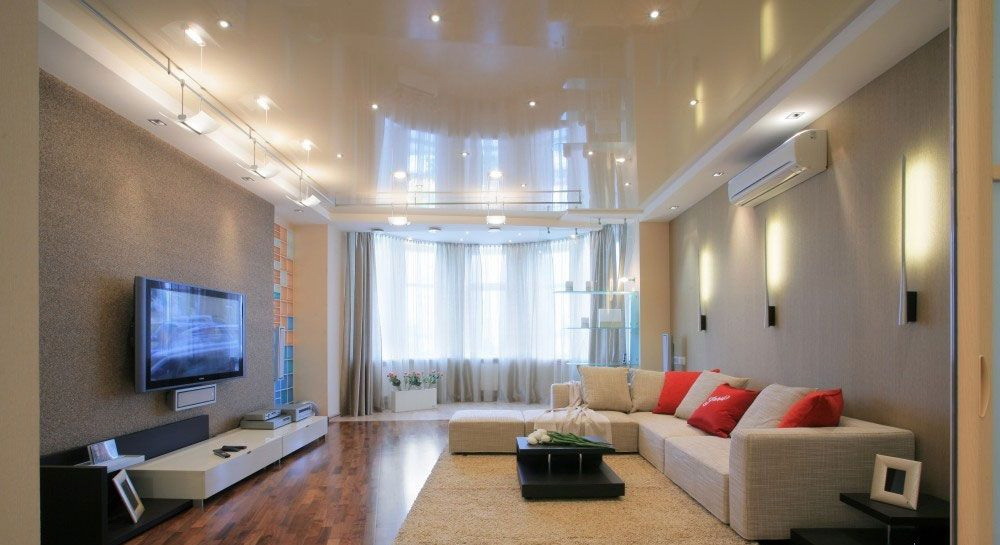 - Suave. A brilhante superfície espelhada de qualquer cor é o teto de filme clássico ao qual todos estão acostumados. Reflete tudo o que acontece abaixo, torna a sala visualmente maior, expande o espaço e parece espetacular.