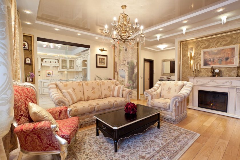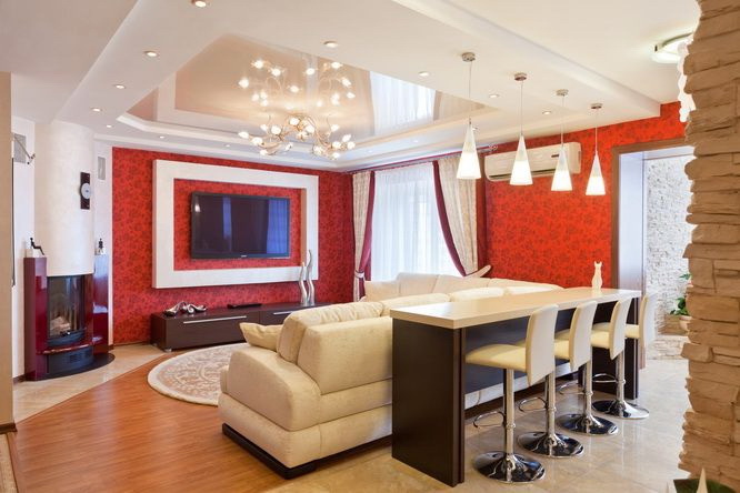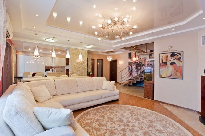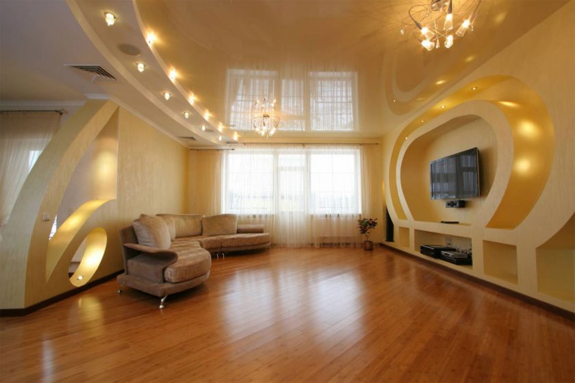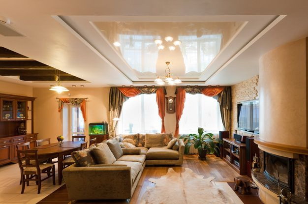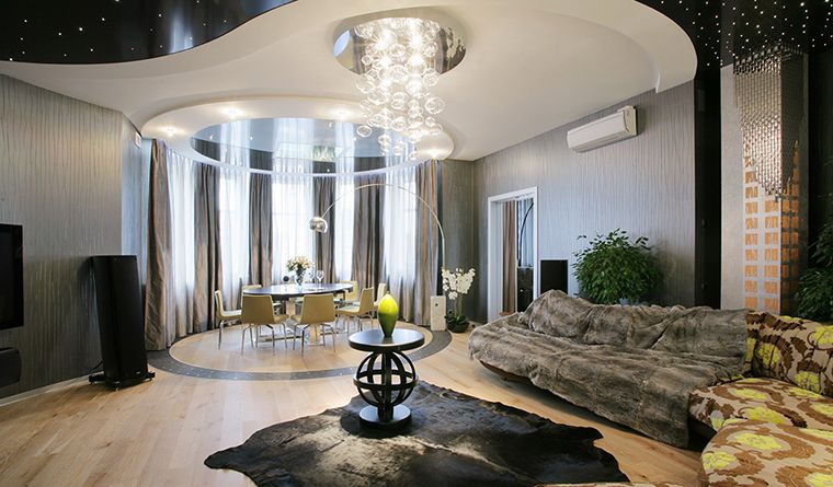 - Contabilidade de elevação. Se a sua sala de estar for notável por irregularidades, comunicações complexas, rachaduras, cavidades, o drywall ajudará a esconder tudo isso de maneira mais confiável do que o teto tensionado.