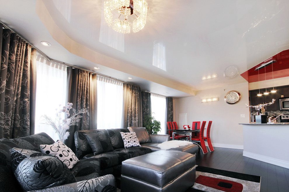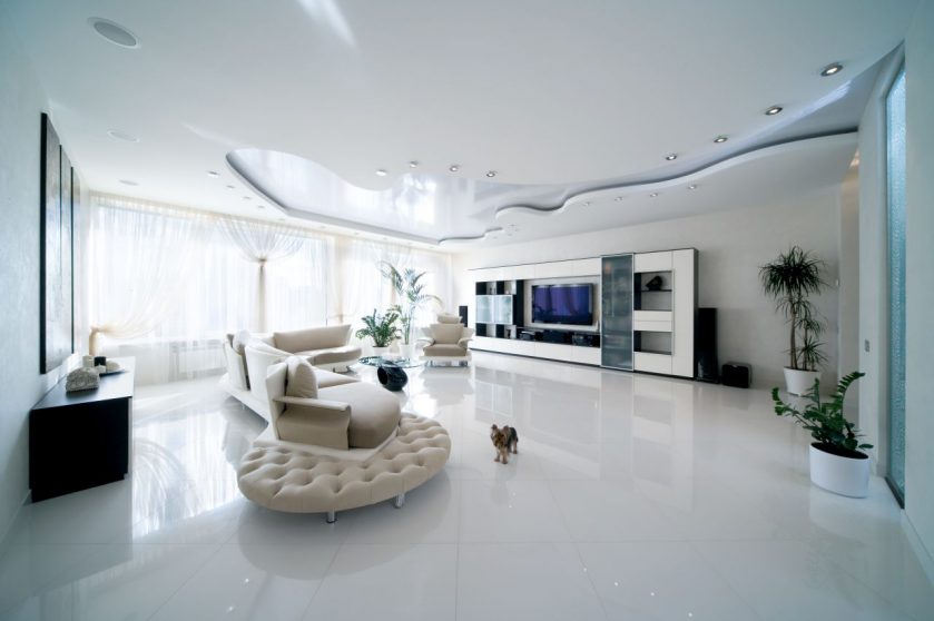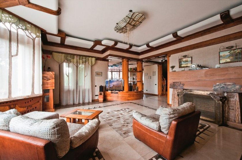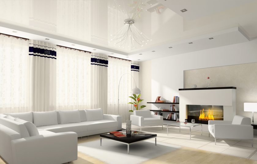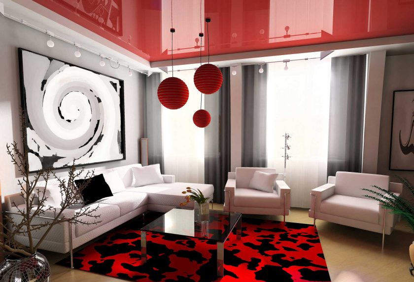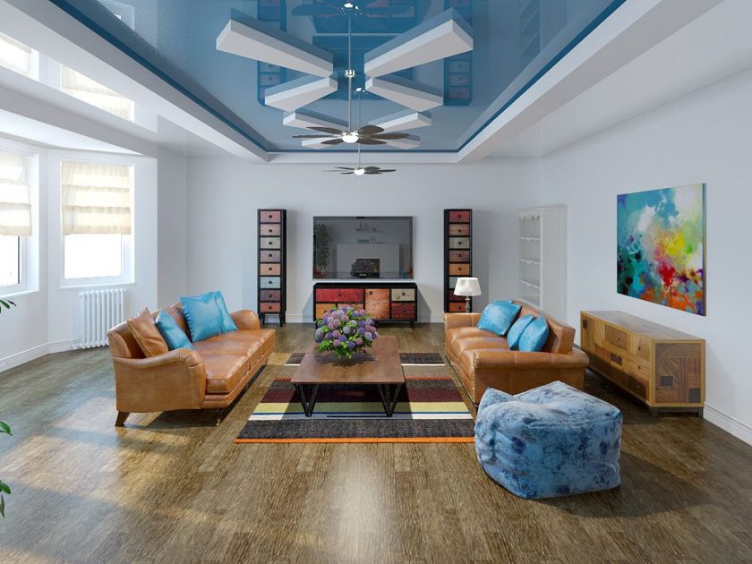 A segunda nuance importante é como o teto é harmonioso com o resto do interior. Como regra geral, a maneira como é combinada com as paredes permite que você bata na mesma sala de maneiras diferentes: