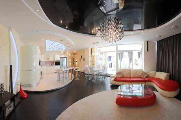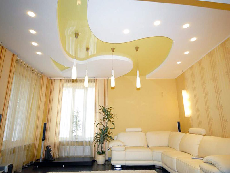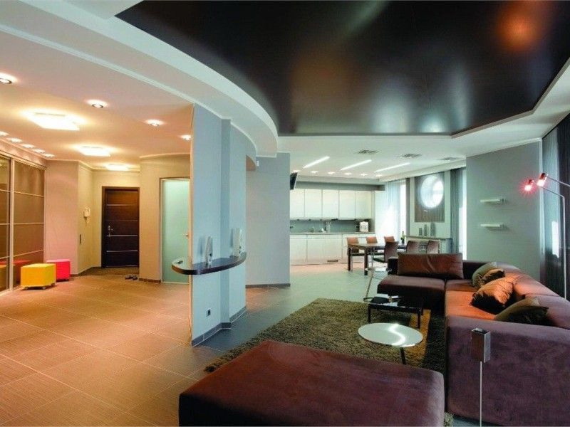 - Flexibilidade. O teto esticado é uma tela plana. O drywall é muito mais flexível, você pode amassá-lo, puxá-lo em todas as direções, fazer construções complexas a partir dele, ajustá-lo a qualquer idéia de design.