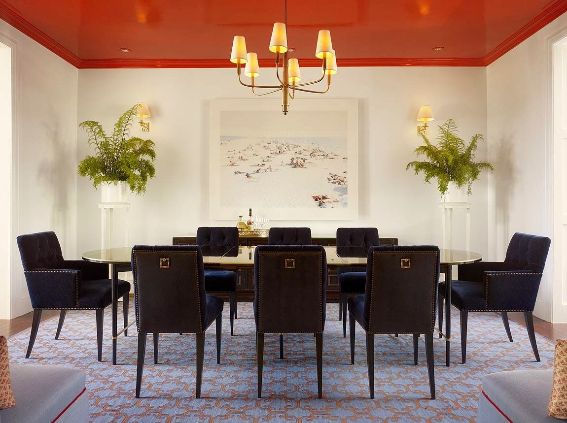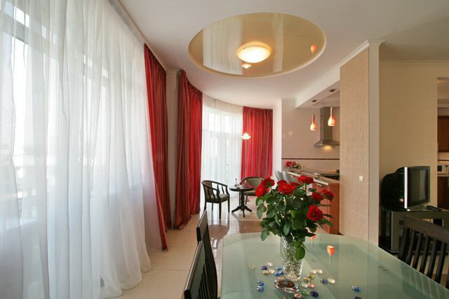 - Faça do teto uma continuação do interior. Não para atrair atenção especial para ele, apenas para desenvolver uma idéia geral. Nesse caso, você precisa examinar cada sala específica. Em grande estilo alta tecnologia um filme de pintura metálica vai caber bem, e em um clássico, um tecido com molduras de gesso cartonado intrincados ficará melhor.