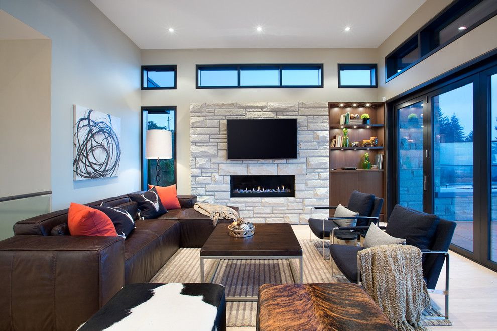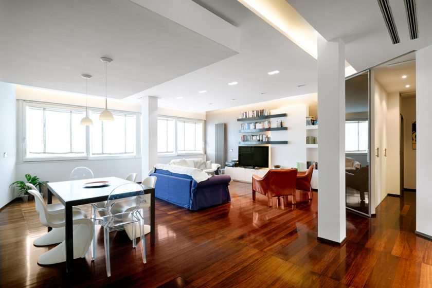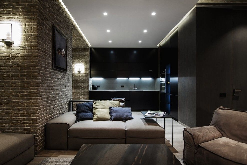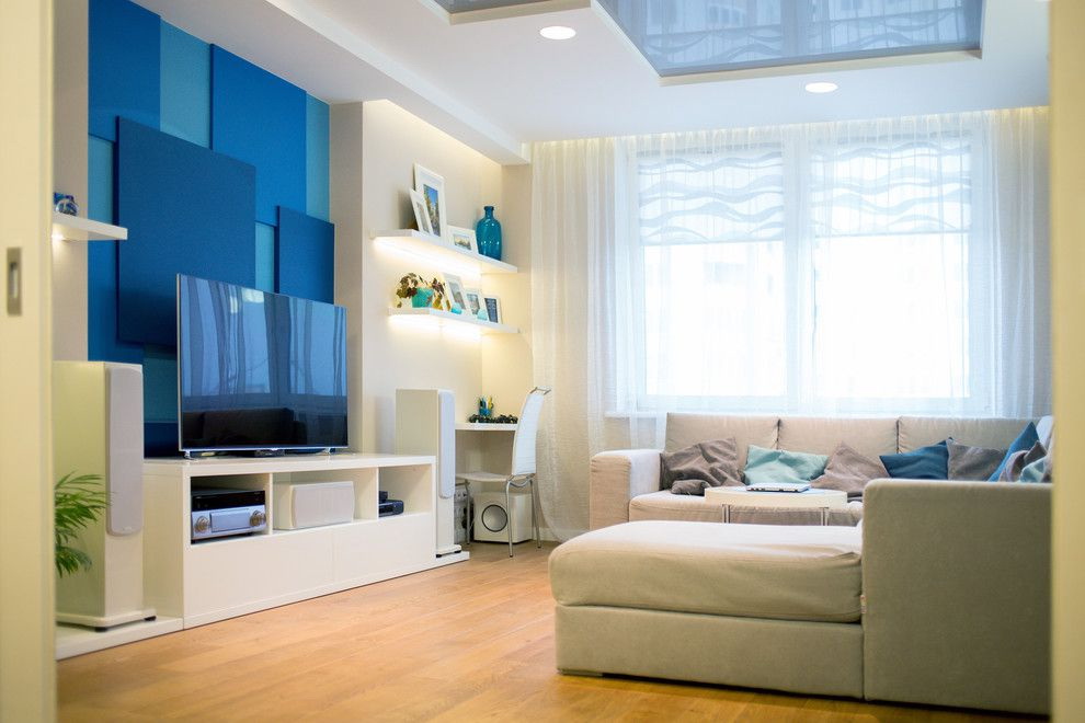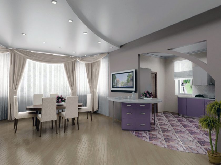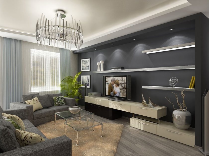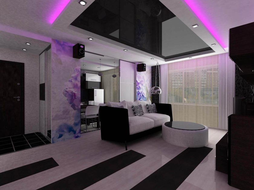 - Divida a sala em zonas. Se você tem um apartamento pequeno e o corredor preenche vários compromissos de uma só vez, isso é aconselhável. Destaque zona de lazer com tv, para separá-lo do resto da sala - ou sofá do livro estante. Neste caso, você precisa fazer uma queda de nível para que fique localizado apenas na junção das duas zonas.
