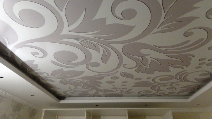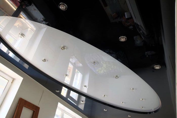 - Diferentes tipos de tetos esticados. Filme brilhante, rodeado por um pano, tecido insere em uma superfície brilhante - como resultado, você pode obter um padrão interessante. Fazer isso, é claro, levará tempo.
