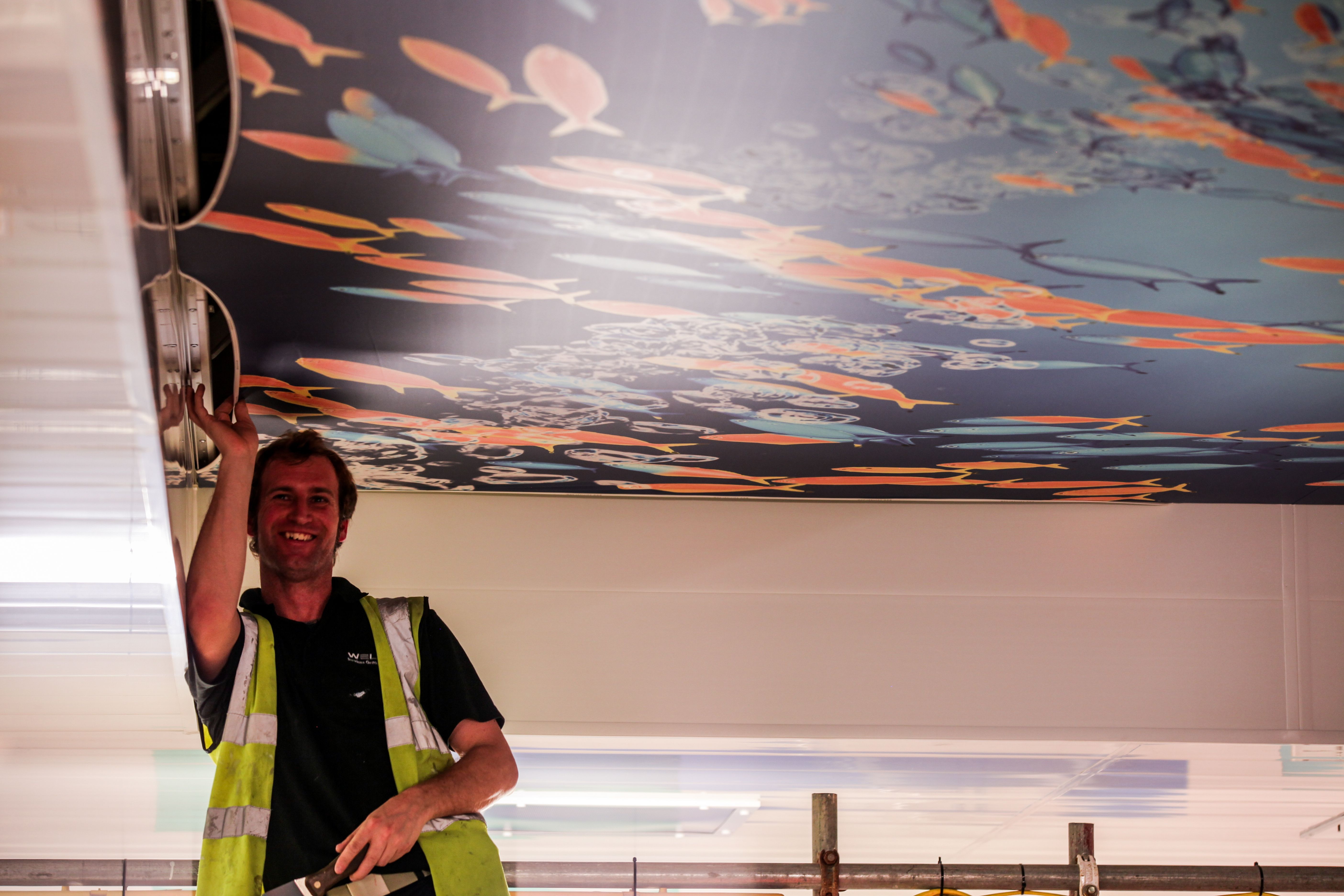 - «Superfície respirável. O tecido é o único material que permite que o espaço acima do teto troque de ar com o resto da sala. Não retém a umidade.