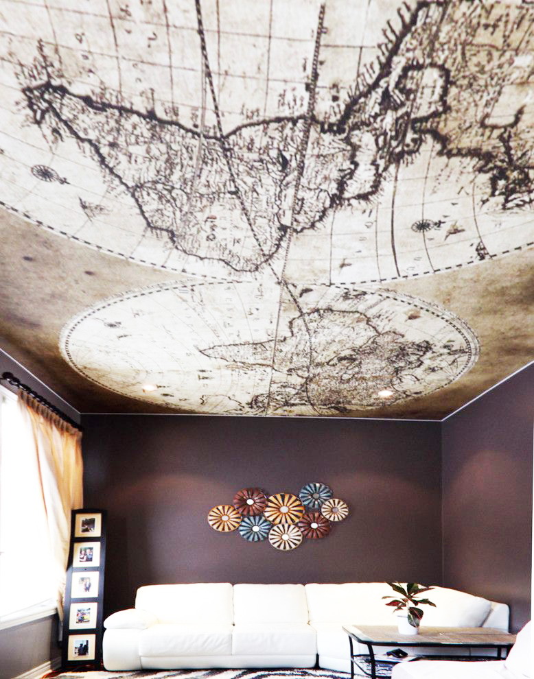 A partir da combinação de cores, você pode fazer um teto separado com padrões e desenhos. Quanto a eles, a principal tarefa do resto da superfície não é atrair muita atenção, entrar no tom principal. Mais adequado para cores pastel claras ou escuras, sem brilho.