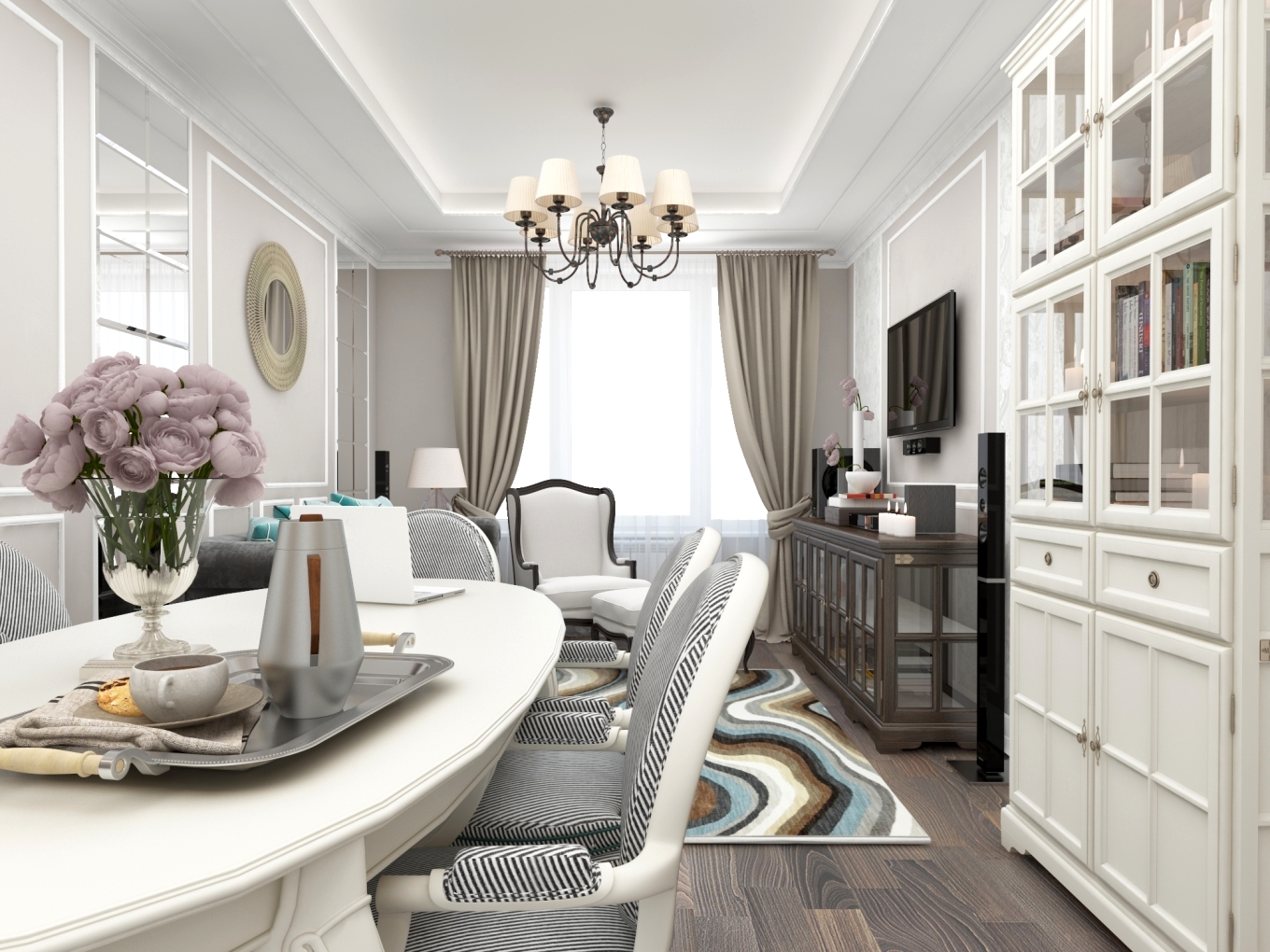 - Tons frios claros. Azul, luzverde, amarelo claro de uma certa sombra. Expanda visualmente a sala, faça com que pareça ainda mais brilhante. Bem adaptado ao estilo clássico.
