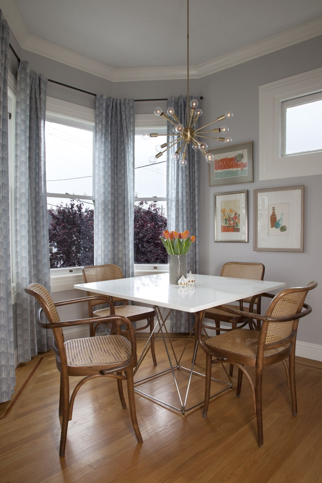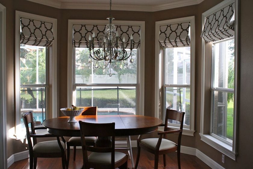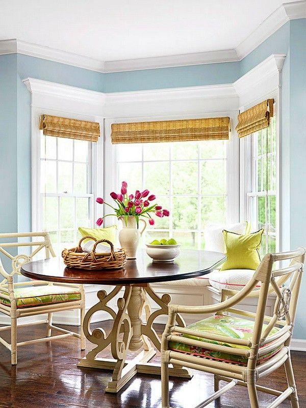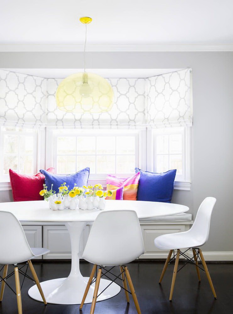 - Cortinas romanas estampadas - Outra ótima idéia para uma janela de cozinha bay. Escolher um padrão lúdico é uma maneira inesperada de trazer diversão para o seu espaço e, como você ainda precisa comprar cortinas, tem a oportunidade de ser criativo.