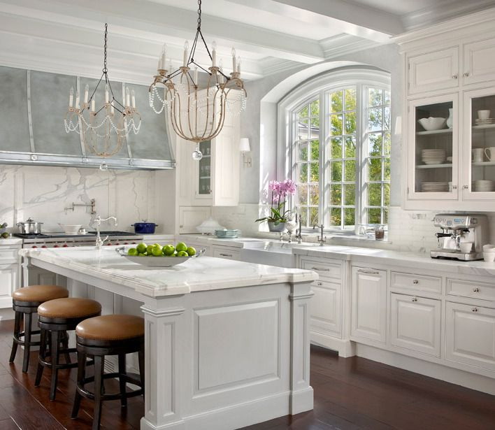 Acentue uma elegante cozinha branca com uma coleção de velas brancas e creme na janela da sacada atrás da pia.