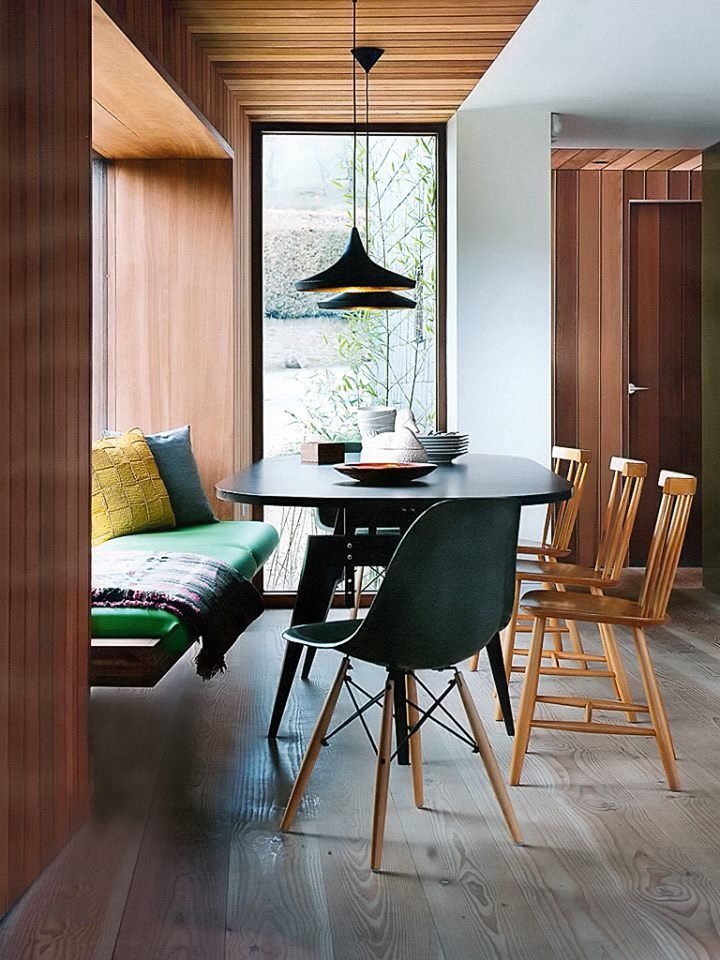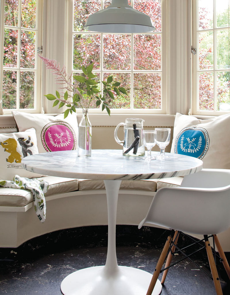 Cativante travesseiros, o tecido de assento também introduz mudanças de textura no espaço se a madeira as dominar, telha e metálico. Se você usá-lo para crianças ou como um ótimo lugar para conversar - uma pequena cadeira na cozinha é sempre útil.