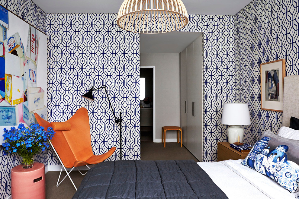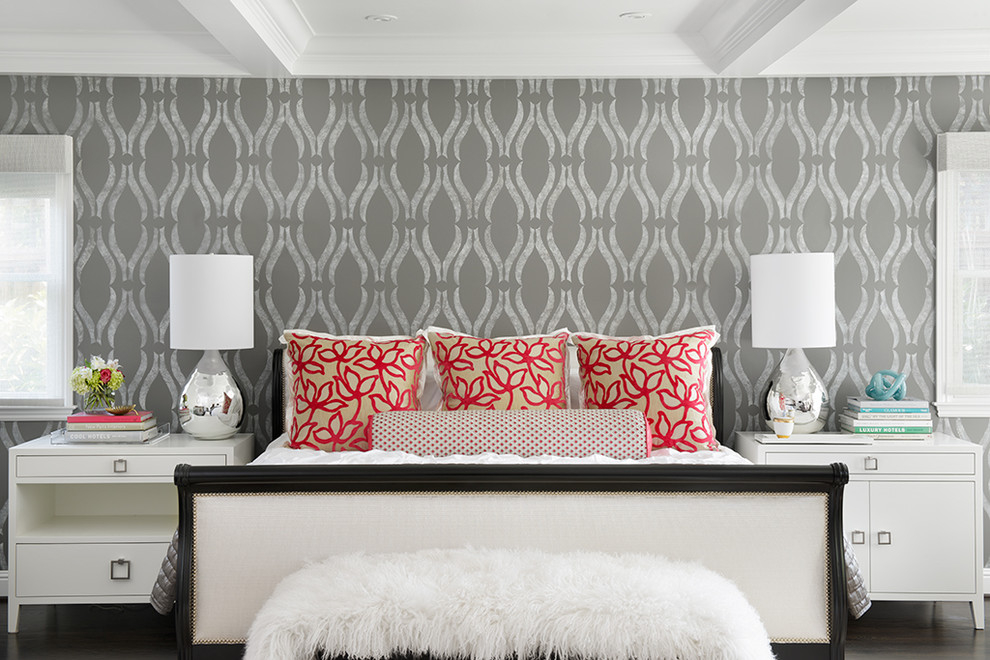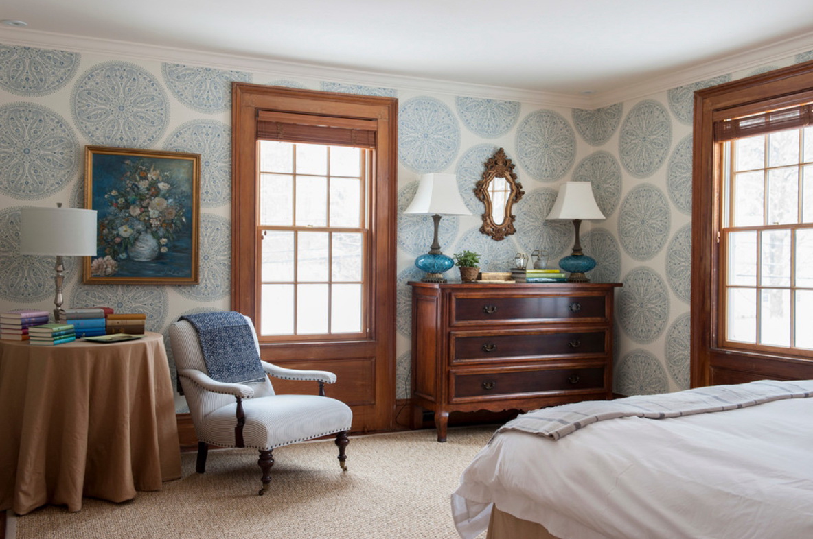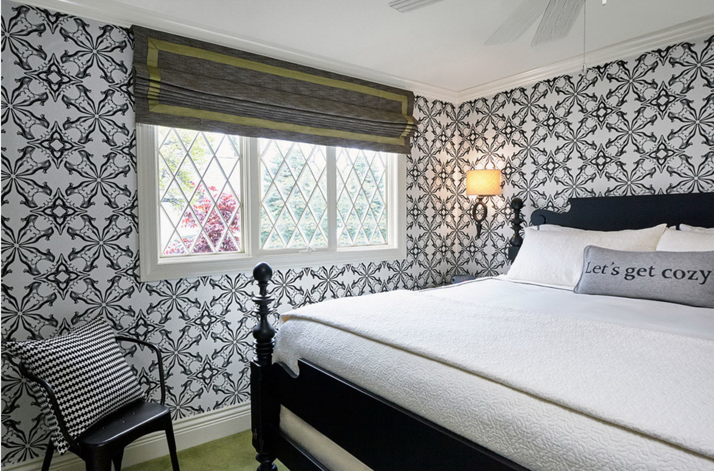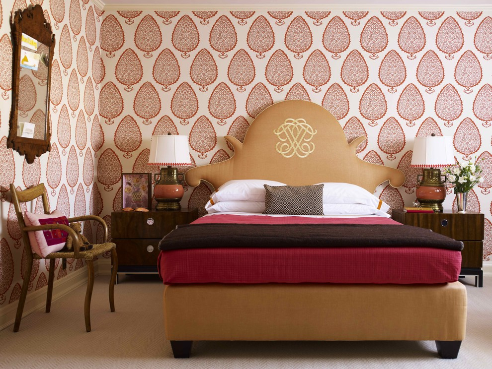 Cobrir as paredes do quarto com um padrão grande requer um pouco de refinamento para criar uma imagem geral holística. Faça certo: